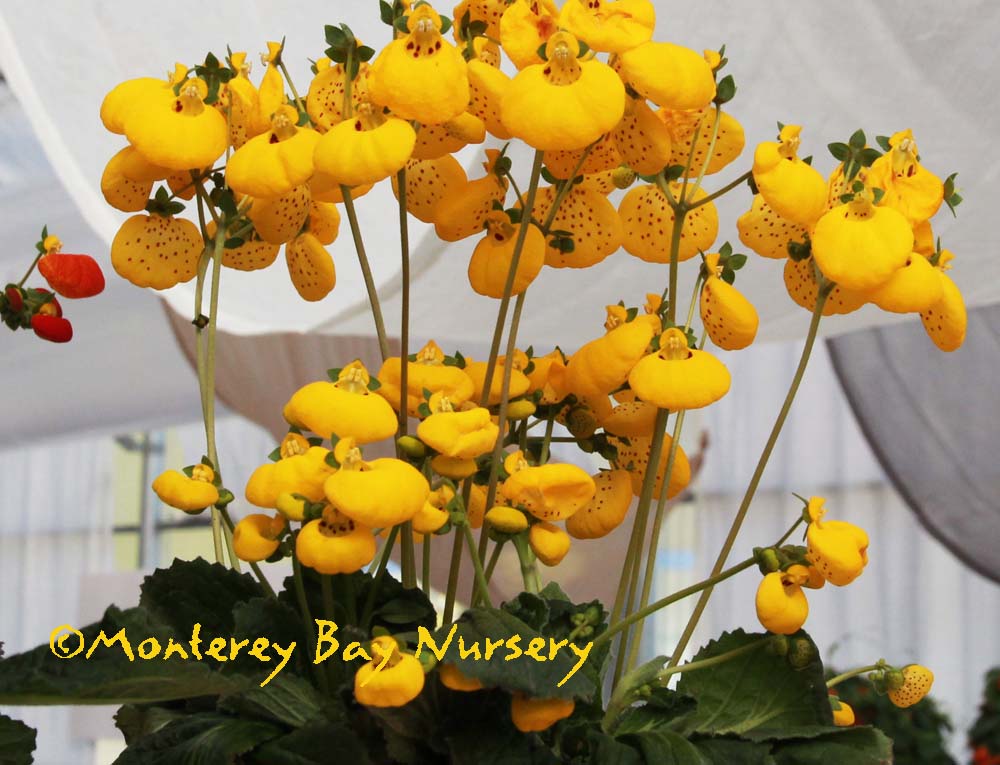 Calceolaria 'Calyopsis Series' SLIPPERWORT, POCKETBOOK PLANT (not currently in production) Red Yellow Red Yellow these new pouch flowers have long stems and look more like orchids than the old-fashioned bedding plant. Irresistible flowers in bright colors, blooming in spring and summer in part shade with regular watering. About 10-12" tall and wide. Dark green crinkly leaves. Hardy to a little below 30F when established, so plant with overhead protection. USDA 9/Sunset zones 16-17, 21-24. rev 3/2015-Suzy Brooks