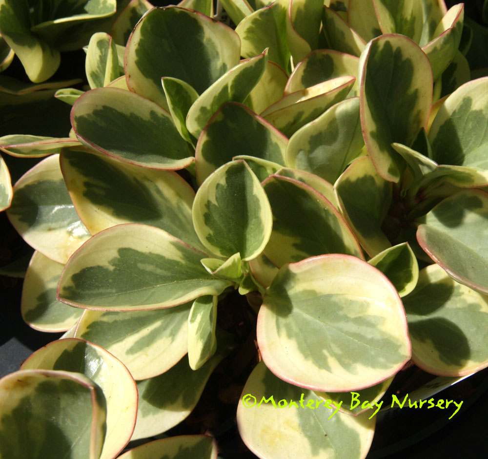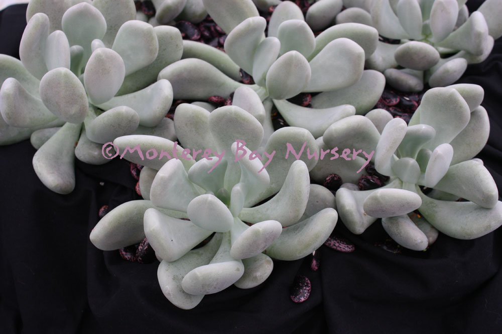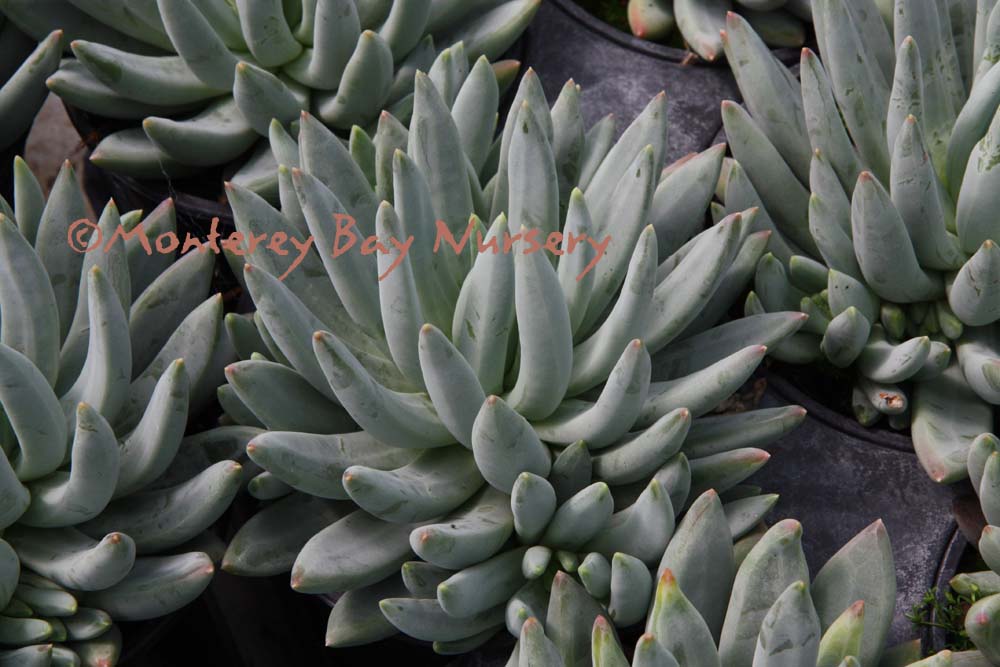 'Exotica' (not currently in production) subliminality   absolutely sublime! Light blue leaves are air brushed with pink on the edges and tips, then covered with a white powdery coating. Grows in a rosette form and clumps. Suitable for hanging pots or spilling over the side of a planted combination planting. Under a foot tall and wider. Sun to part shade. Appreciates watering while growing but much less in winter. Shelter from cold in winter outside Sunset zones 21-24/USDA 10. rev 4/2012