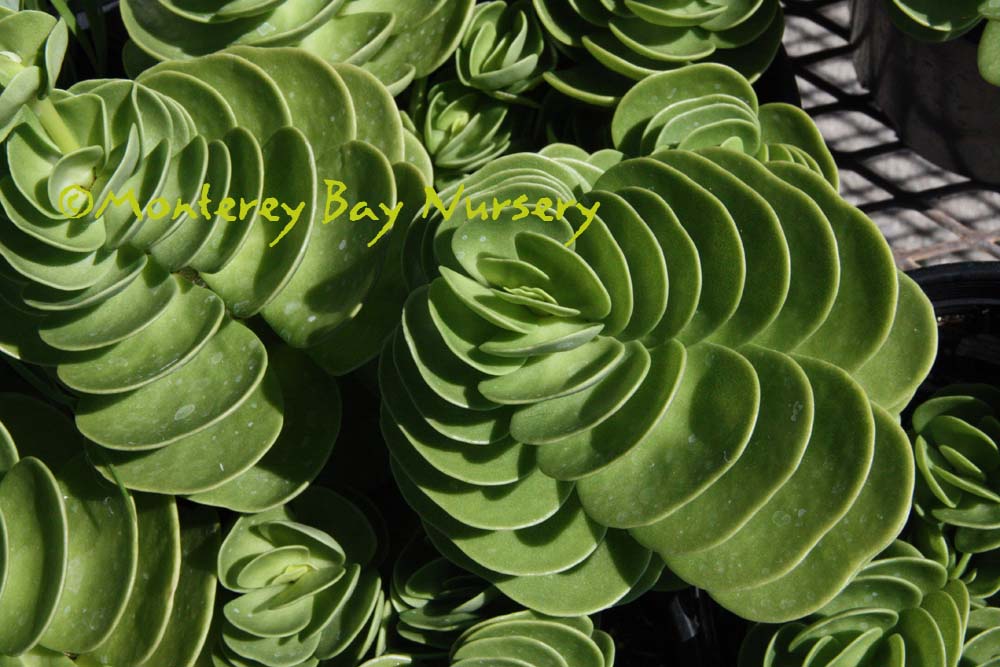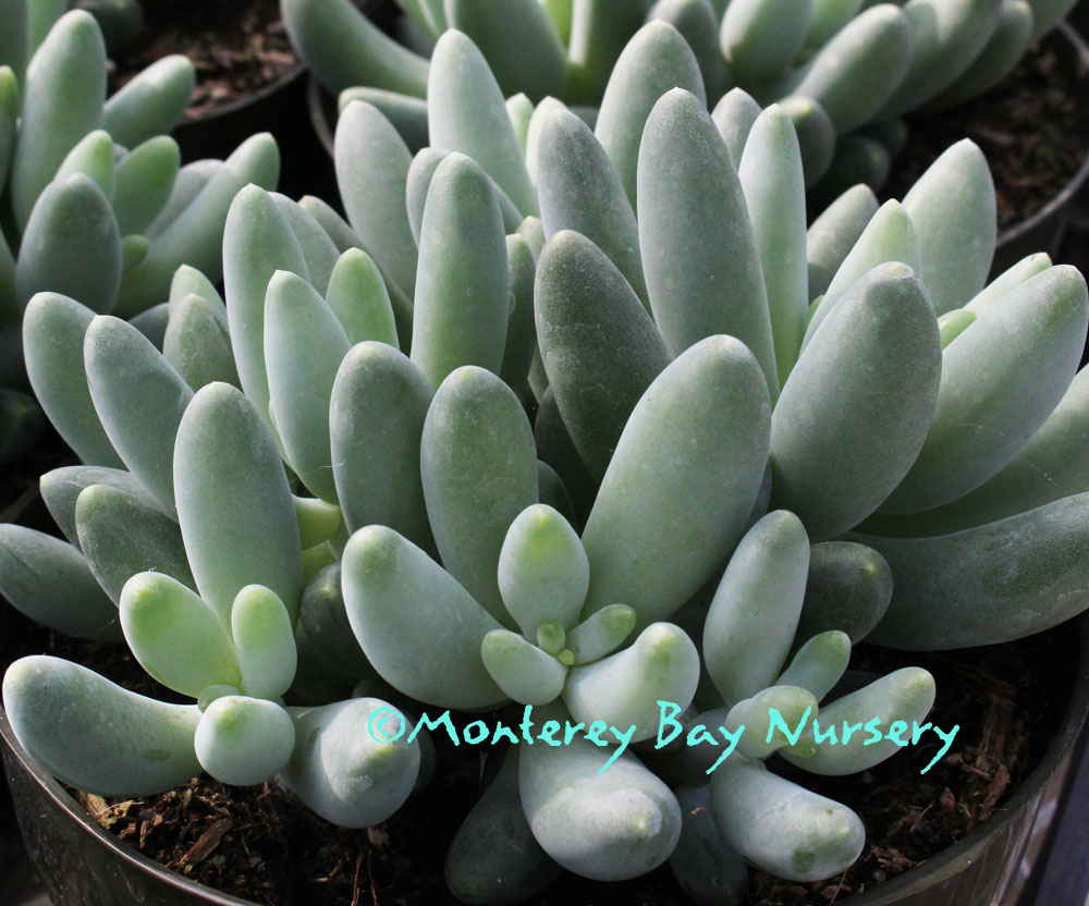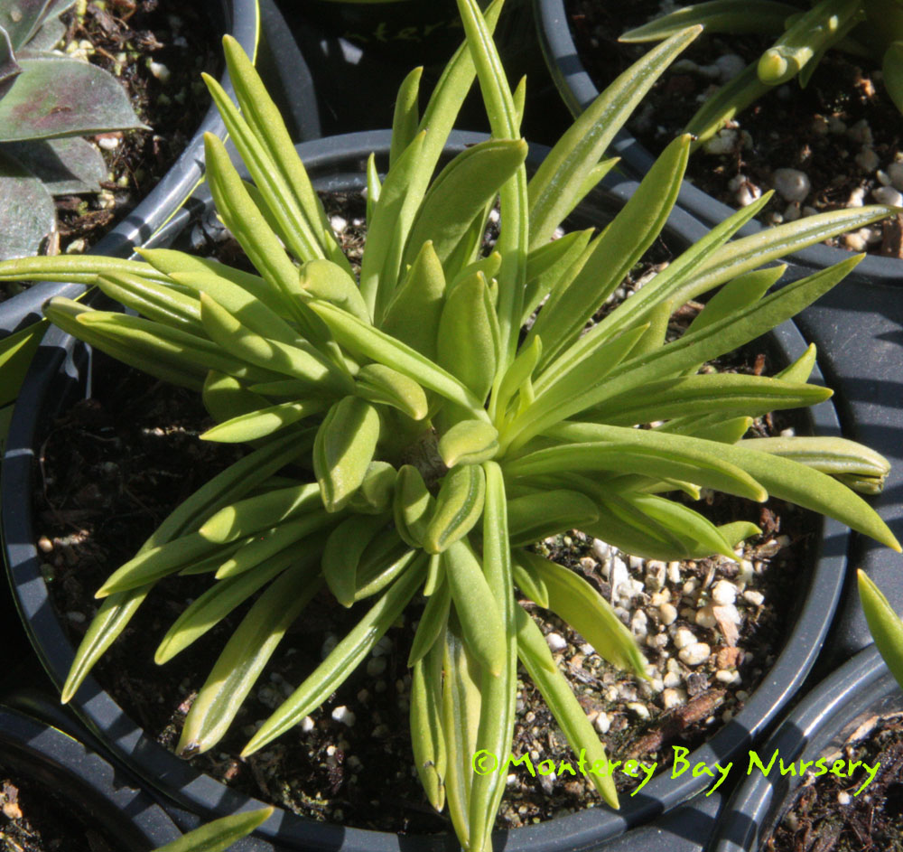 'Caterpillar'   (not currently in production)  cool sea green  thick-fingered leaves form stemless rosettes less than 12" tall. Slow, clumping, a stunning container subject when mature. Grow in sun to bright shade with spring-fall watering, keep dry in winter. Indoor/outdoor or with winter protection in USDA zone 9/Sunset zones 16-24. rev 5/2019