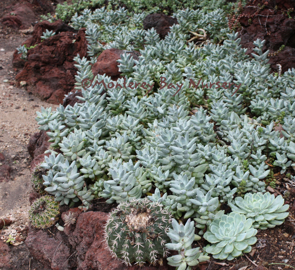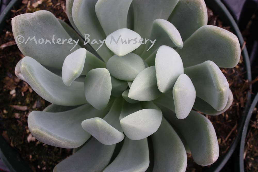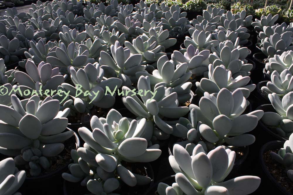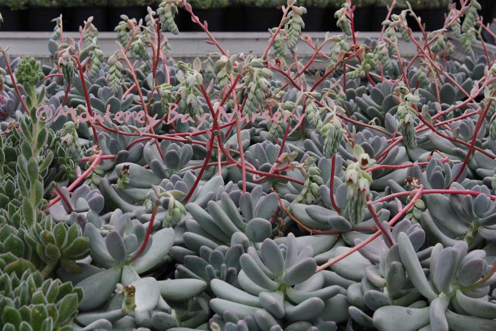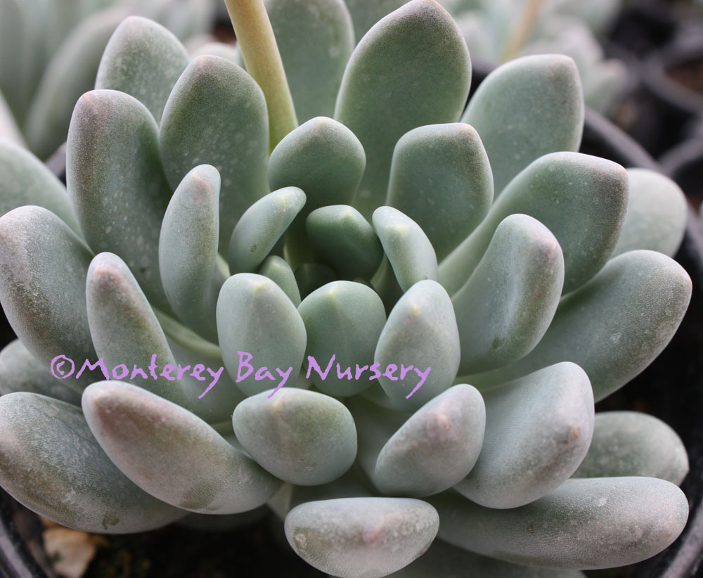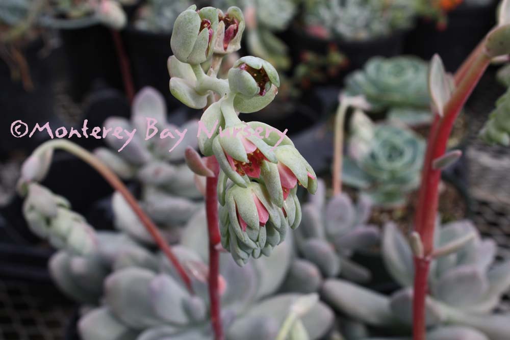 'Round Leaf'   (not currently in production) round leaves   flowers   coral stems    probably Pachyphytum oviferum crossed with an Echeveria according to John Trager. The flower scapes certainly fit a hybrid-origin theory. Foliage is grape-like, and I mean like the grapes themselves, not the foliage of grapes, being giant, oval-round succulent things. They are powdery blue grey green with a glaucous cast, and the plants are very compact growing, with shy, bell-shaped coral red flowers produced on arching, pendant spikes. The coral red spikes actually provide most of the "flower" color since the flowers themselves only peek shyly from between their sepals. rev 3/2013