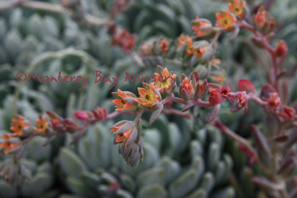 bracteosum  (not currently in production)  pastels  beautiful, powdery blue, flattened leaves with rounded edges have pink highlights, and form a loose, open rosette. Nodding flower stalks in spring straighten as the coral flowers open. A great container subject, alone or mixed with other succulents. About 12" tall and wide, forming a clump of silvery leaves that look like polished stones. Part sun or bright light. Water in spring and summer, but deals with cold better if kept dry in winter. Indoor/outdoor or with winter protection in USDA zone 9/Sunset zones 16-24. rev 5/2019