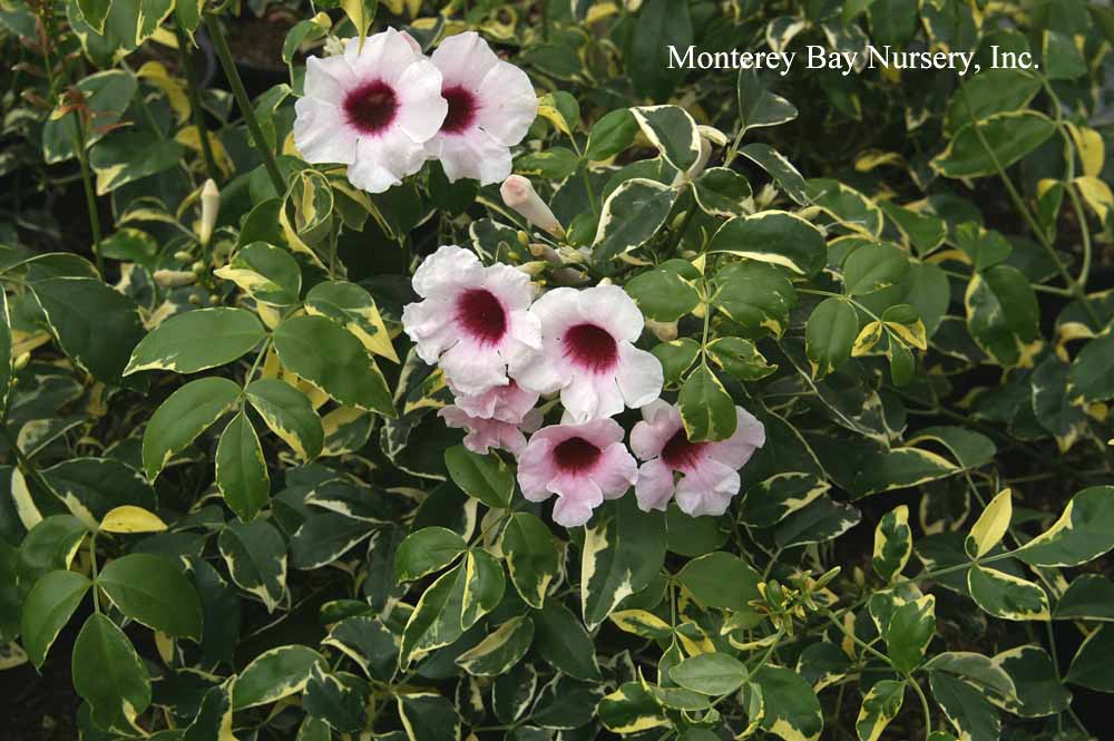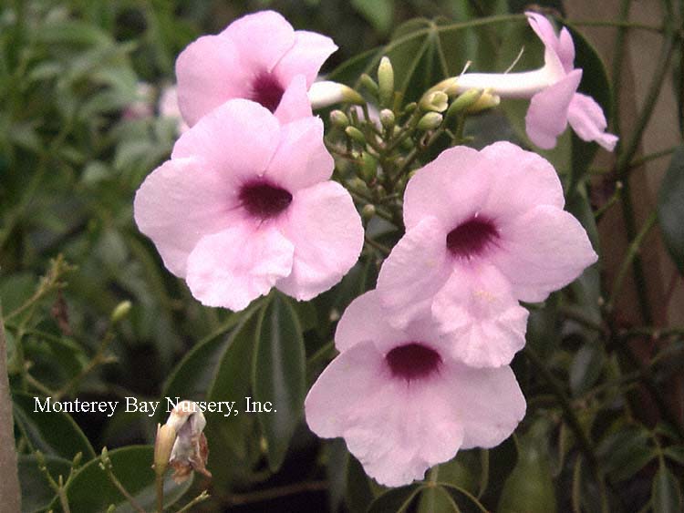 Pandorea jasminoides  an evergreen vine of moderate vigor, twining to scandent, with coarsely divided, glossy, pinnate leaves and clusters of white or pink trumpet shaped flowers produced in clusters almost throughout the year in cool-summer climates. The forms in the trade all clearly initiate well with modest chill, but may be short-day initiators as well. This is a good vine for containers due to initiating flowers readily for at least half the year in most areas of California, making it less than a rampant grower, and responding well to being restrained by cutting-back. It also tolerates water-stress well in containers, and can recover well from wilting down when necessary. It attracts hummingbirds and has very low seed-set almost always. It will also take relatively exposed coastal sites. Grow in sun to part shade with average to little summer watering, less flowering with the later option. Takes 25°F without apparent damage but was killed or severely damaged here at 20°F, resprouting from the roots well though when sited in the ground. Southeastern Australia. Bignoniaceae. rev 9/2020