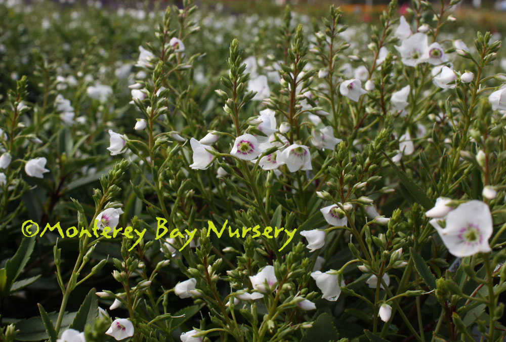 Parahebe linifolia   (not currently in production)  charming  a sweet and petite small perennial shrub with narrow, dark green leaves that bears profuse little white flowers, with a red ring around a green eye. A great filler in the garden under roses, along with grasses, and a perfect wingman to almost anything. About 12-18" tall, 2' wide, for sun, part shade, average watering. Sunset zones 5, 6, 15-17, 20-24/USDA 8. Plantaginaceae. rev 7/2014