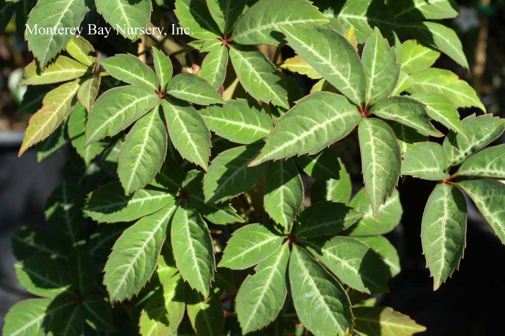 henryana  SILVERVEIN CREEPER  silver veined leaves   a formal looking, classy vine with dark velvety green palmate leaves. Each of the five serrated leaflets is neatly highlighted with silvery veins. New growth and leaf reverses are reddish purple. Slow to start, but moderately fast after a year or so. This one clings to walls by tendrils but is considerably less aggressive than other species of Parthenocissus and always remains manageable, ultimately reaching to about 20'. Best leaf color in full sun but in hot California areas it is best in at least part shade. Deciduous, with velvety dark maroon to wine to hot glowing red fall color. Berries are blue and very ornamental but not heavily produced. Hardy to USDA zone 7, about 10°F. China. rev 4/2021