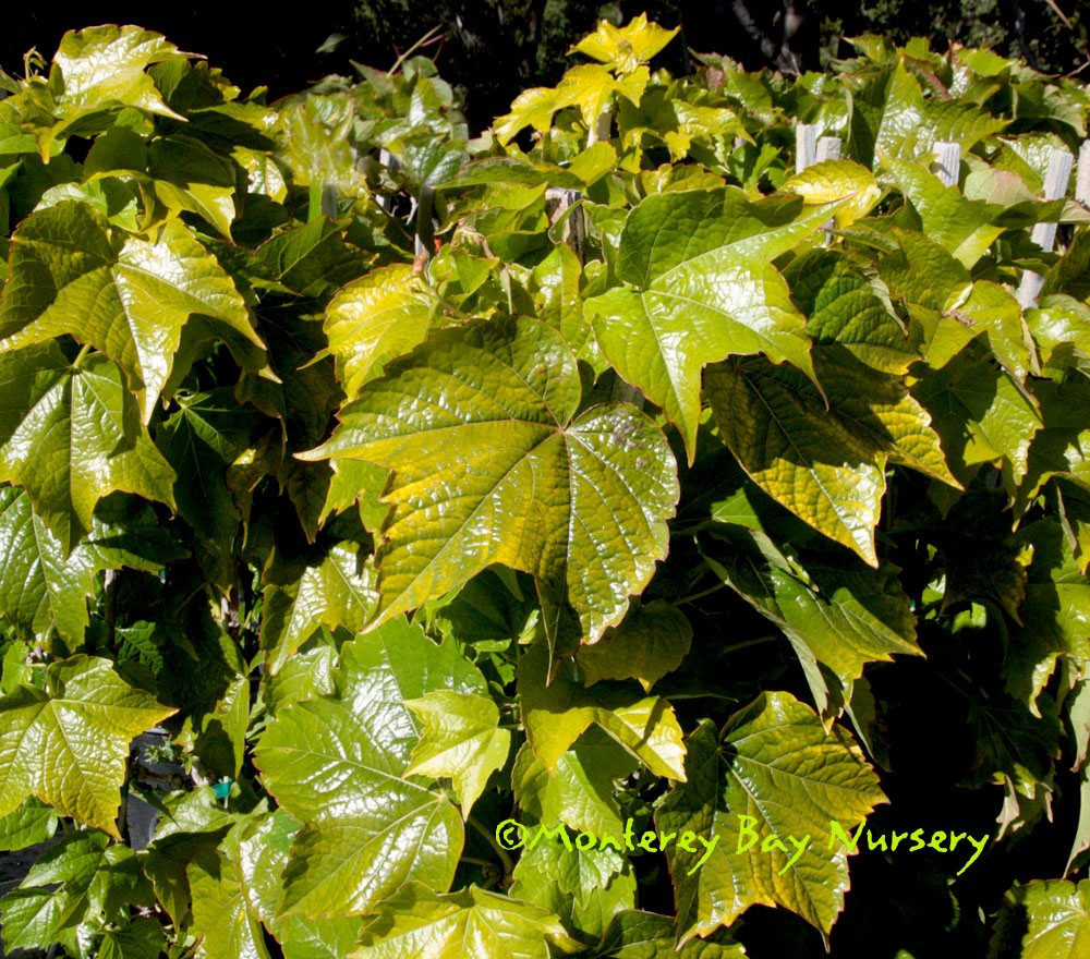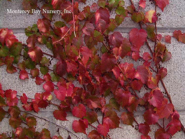 quinquefolia  (not currently in production) VIRGINIA CREEPER  always a show-stopper, and my favorite of this genus because of its dependably brilliant, hot orange-red to fluorescent red-pink fall leaves. Very fast, very drought tolerant when established. In the East stems can reach over 100' but it is usually much smaller here in brighter, drier California. Found naturally from southeastern Canada through the eastern US, eastern Mexico and into Guatemala. Full to half sun, average to very intermittent or occasional watering, USDA zone 3b if grown from cold-region ecotypes. rev 9/2020