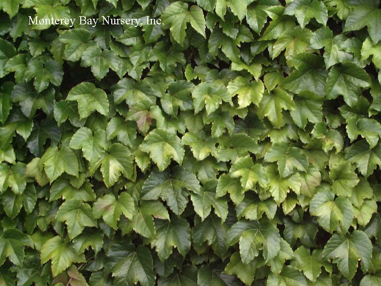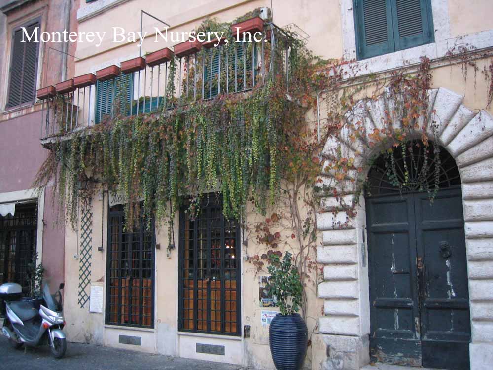 tricuspidata  BOSTON IVY  Piazza Navonna, Roma   lush foliage   fall color   against a wall  a moderately fast deciduous vine, climbing by sucker discs at the tips of tendrils. Leaves are divided into three leaflets, turn dark maroon red and bronze in winter. May hold foliage until spring in mild winter areas. Sun to part shade, average to little summer watering when established, frost hardy to USDA zone 4. Central China, Japan.  rev 1/2006