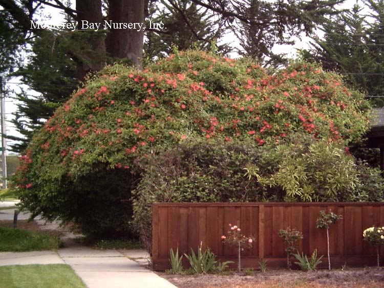 CORAL PINK PASSIONFLOWER  closeup  typical habit  one of the showiest, most vigorous, fastest growing vines for California climates. I have seen it swallow an oak tree,m but it was probably put on this earth to cover chain link fences. Still, it can be restrained to reasonable size by annual or biannual pruning and is well worth the effort for the heavy and almost continuous display of bloom. Showy intricate flowers to 4" across are well displayed, covering the outside of the plant from spring through fall. It is damaged below 27°F, but it will resprouts from the roots at even colder temperatures and recovers extremely quickly, drawing from reserves stored in its roots. Still it will be unhappy if it is severely damaged every year, and it may eventually lose its crown. This plant is a five star hummingbird attractor. It also attracts humans, especially children (but me too), who have found they can bite a little hole in the bulb at the base of the flower tube and suck out the pool of nectar that collects there. Grow it in at least half a day of direct sun with average drainage or better, infrequent summer watering in cool summer climates, and sited where you can appreciate the flowers. There may be a couple of very similar cultivars in the trade going under the name ‘Coral Seas.’ rev 10/2005