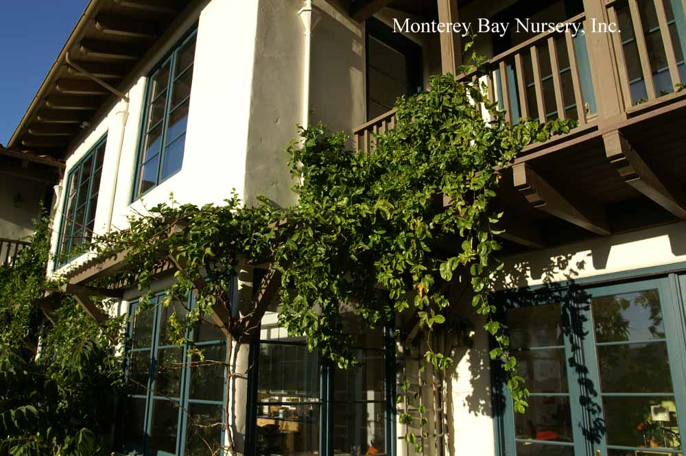Passiflora   PASSIONVINE, PASSIONFLOWER, PASSIONFRUIT   mostly fast vines, mostly evergreen, but at least one species, our native American Maypop (P. incarnata) is deciduous. Many have edible fruit though many also do not self-pollinate here readily. All species are from the New World. Passifloraceae. rev 8/2018