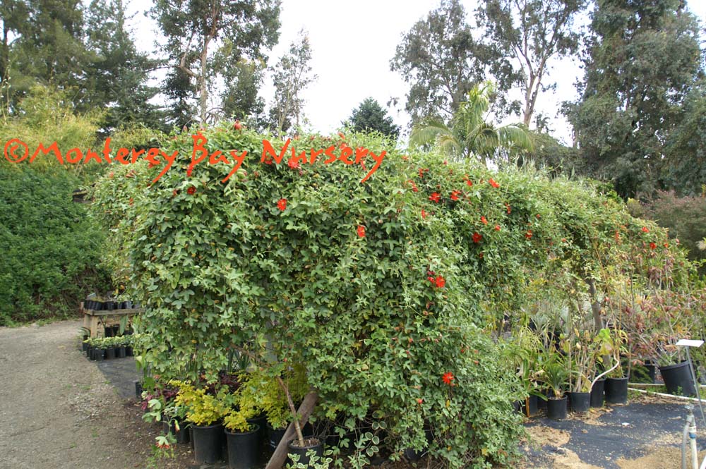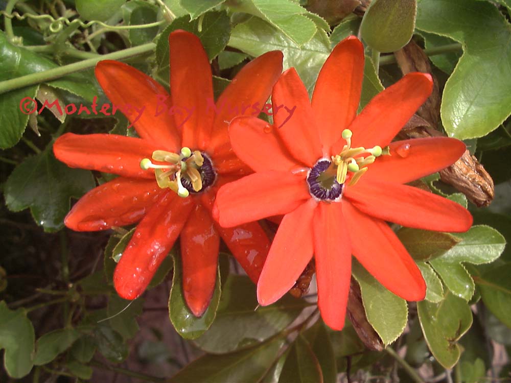 manicata 'Linda Escobar'   flowers   taking care of the competition at Buena Creek Gardens   arguably the showiest variety and nicest flower of any species of Passionflower. The intense orange red color, dark blue coronal filaments, excellent flower size and petal conformation, and nicely held flowers that face out and up on the outside of the foliage canopy make this one hard to beat if you have the climate to grow it. It is an improved version of the species, differing as far as I can tell only in that critical point that it is facultative or simple long day initiation whereas P.manicata itself seems to be long day or very long day initiation, restricting its flowering to three summer months. This selection can flower for 7-8 months. This is right up there with the finest Salvias and Grevilleas for attracting hummingbirds, with its easy-to-find and copious nectar supply and perfect color. It is a close partner to 'Coral Seas,' matching it in almost every way except tint, and that 'Coral Seas' may have a slight edge on it in the way of flower production. Expect the same unparalleled vigor and rampant growth (can cover a house or bring down a oak if not controlled) and essentially identical behavior in frosty conditions (severly damaged below 27F, and often killed to the ground or beyond at 25F). Sun, average soils, rather drought tolerant when established and much better controlled by restricted watering. Northern South America. rev 3/2008