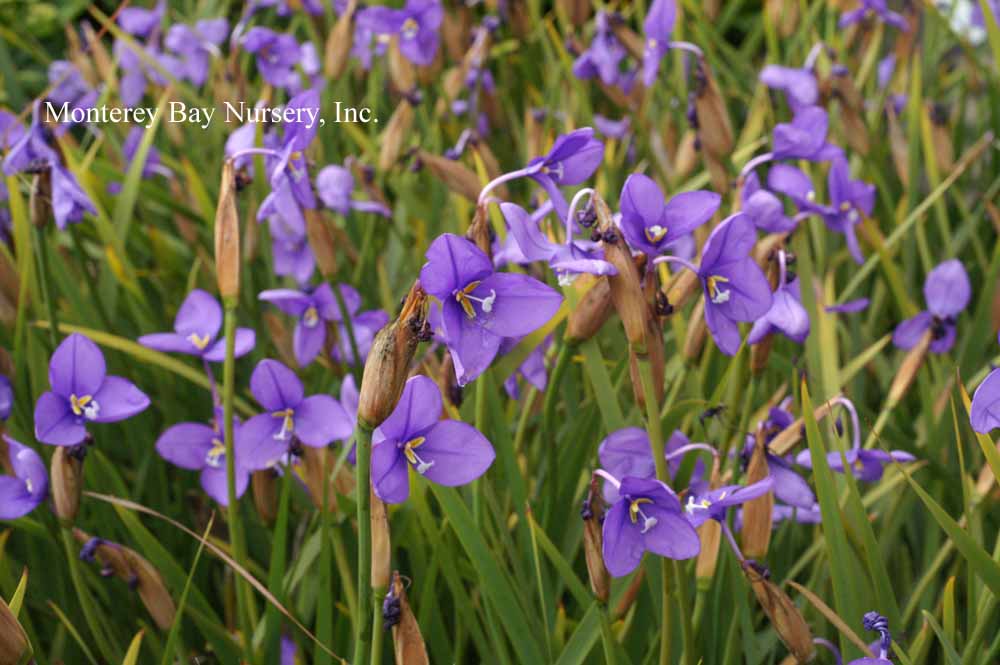 Patersonia occidentalis  PURPLE FLAGS  blooming  should probably be pronounced "Pay-ter-sonia." This evergreen iris relative, something like an Australian version of our native Pacific Coast iris, found growing in widely distributed regions across the continent. It bears showy medium purple flowers to about 2" across on stalks to about 12-18", just above the leaves. They are produced heavily in spring but also show color right through summer, fall and winter, unlike our native iris which are strictly spring blooming (except for one variety). This has been an extremely bulletproof grower for us, with no losses in production. This is rare for most of what we grow, you always expect to lose a few plants for one reason or another, but particularly so for Australian varieties. I think this plant deserves wider consideration and use, especially in commercial or large scale situations where our native iris or hybrids are desired but growing conditions aren't optimal. I have seen large, good looking permanent plantings in Santa Cruz growing in wet, perched soils, one near West Cliff Drive. Drought tolerant, probably frost tolerant to 20°F and probably more. Needs only average drainage and little summer watering but clearly will tolerate summer watering if applied. If plants look ratty, treat them like our own native iris and shear them to the ground around December. There is a yellow variant but I haven't seen it in the trade in the US. Australia. Iridaceae. rev 10/2005