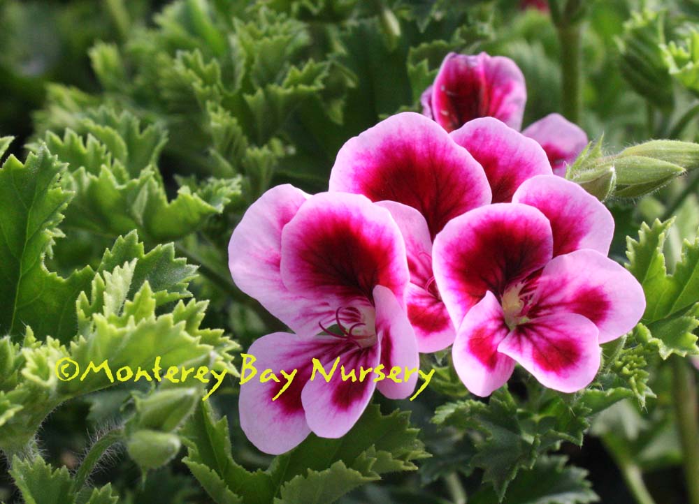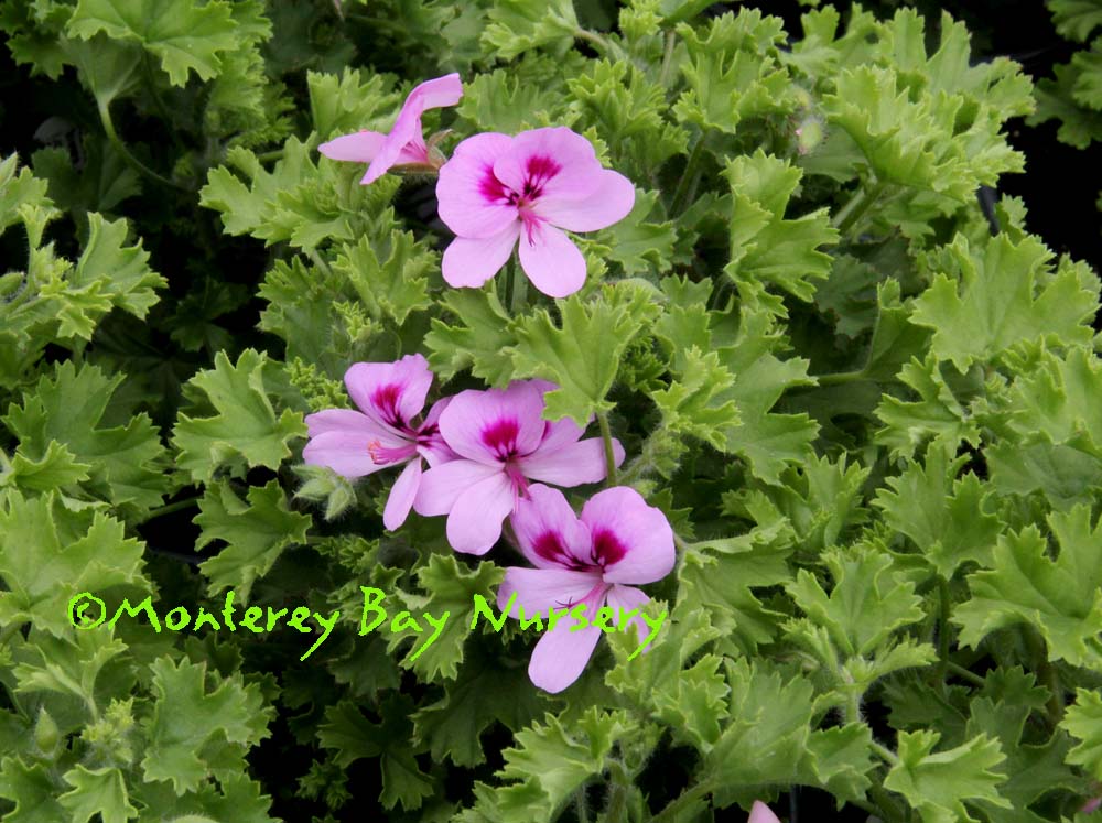 'Bitter Lemon' (not currently in production)   cut foliage   one of the A-grade Scented Geraniums, with a particularly clean, strong lemon fragrance. This forms a compact mound of cut green foliage to a couple of feet high and wide with respectable pink and violet flowers being produced from May through summer. This can be used as a soft-wooded permanent landscape shrub in most of populated California, or spotted in perennial borders and Mediterranean-themed gardens. Or you can grow it indoors in a bright location where you can enjoy the fragrance easily. Suzy had a row of mixed scented g's where her dog ran along the fence -she claims it improved him. Sun or part shade, regular to infrequent watering. Sunset zones  8, 9, 12-24/USDA 9. rev 11/2011