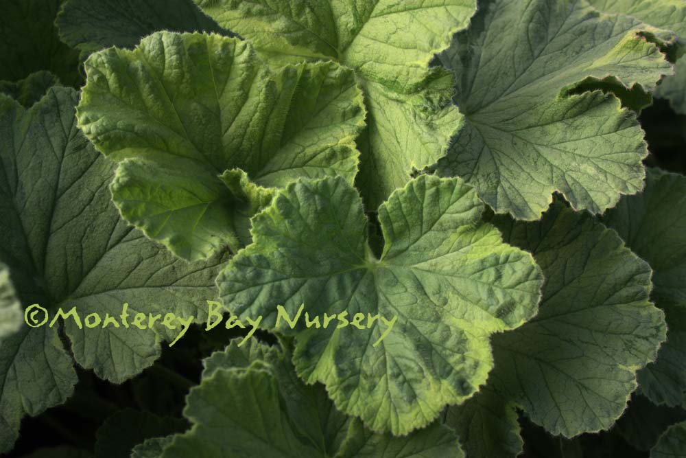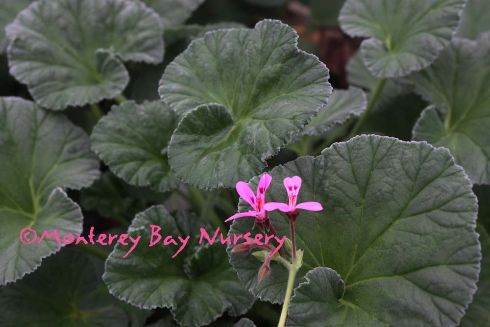'Mable Grey'  (not currently in production)  plus flowers!  one of the strongest smelling scented geraniums, lots of lemony goodness! Big, rough leaves on a tall plant, upright, 3-4' or more, a good one to train up a stake as a standard. Bright pink flowers in summer. Plant in well drained soil in the herb garden or in containers, but within reach to ruffle up those leaves and release the fragrance. Move to shelter in winter outside Sunset zones 8, 9, 14-24/USDA 8. rev 7/2012-Suzy Brooks