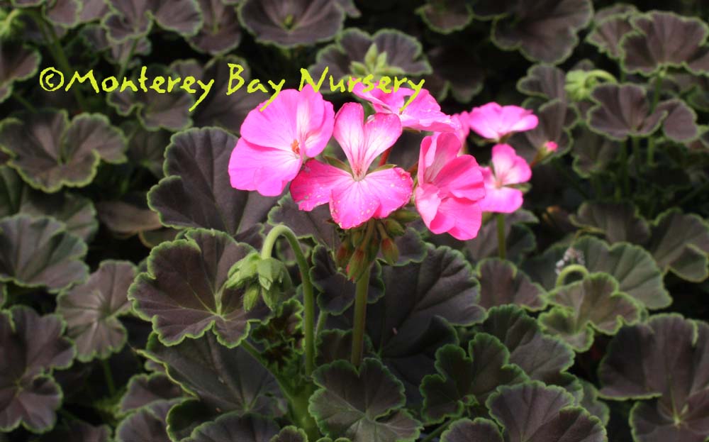 'Black Velvet Rose'  (not currently in production) nice contrast  dark chocolate brown leaves are ringed with green and are a wonder in themselves, but the pink flowers with a white eye crown them and make a beautiful presentation. Terrific choice for windowboxes, containers, or the flower bed. About 12-14" tall and a bit wider. Best color in sun, average watering. Offer protection in winter outside of Sunset zones 8, 9, 12-24/USDA 8. rev 5/2012-Suzy Brooks