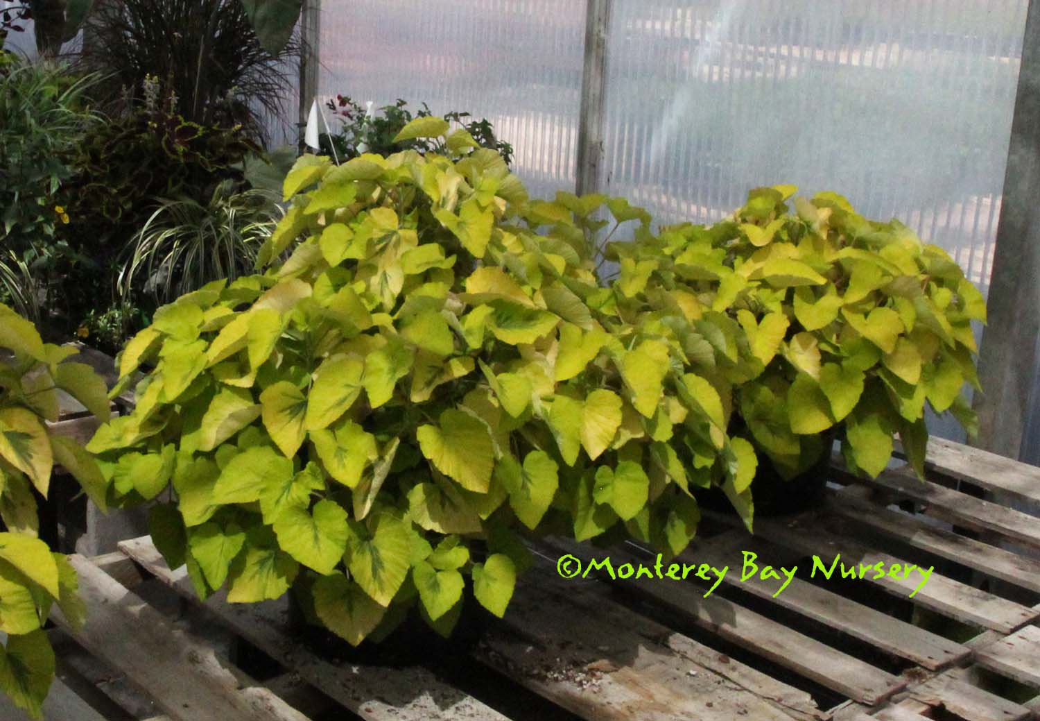 cordifolium 'Caroline's Citrine' PP24132  why you grow it    another reason   garden plant, north exposure    heavy flower show   won't  .  .  stop  .  .  blooming!   discovered by The Garden Company's own Lance Reinerts, the Supreme Commander of the Universe Over All Rare Variegated Plant Collectors (do you have variegated poison oak? Well then how about tanoak?), this is possibly the most dramatic foliage plant ever introduced. The brilliant yellow chartreuse (full shade) to warm gold leaves (bright shade to part sun) really light up, especially against dark backgrounds. It can bloom very heavily and spectacularly as well sited such that it doesn't burn in concentrated afternoon visible and IR radiation. The gaudy light rose pink flowers will initiate readily with almost any amount of daylight plus modest chill (~45-55F), a hard lesson we learned in propagation here when trying to start large scale production. Plants rooted but just wouldn't grow, they just bloomed heavily and continuously in our very cool prop houses. This one has been a long time working up to being available, we expect it to become a favorite quickly now. The very similar sister variety, its own all-yellow sport, is 'Donn's Goldstrike' PP24131. Even more brilliant foliage, same flower power, a little slower. Both are outstanding as porch/patio container plants, perhaps their best application. USDA zone 9 (protect from hard frost). rev 8/2018