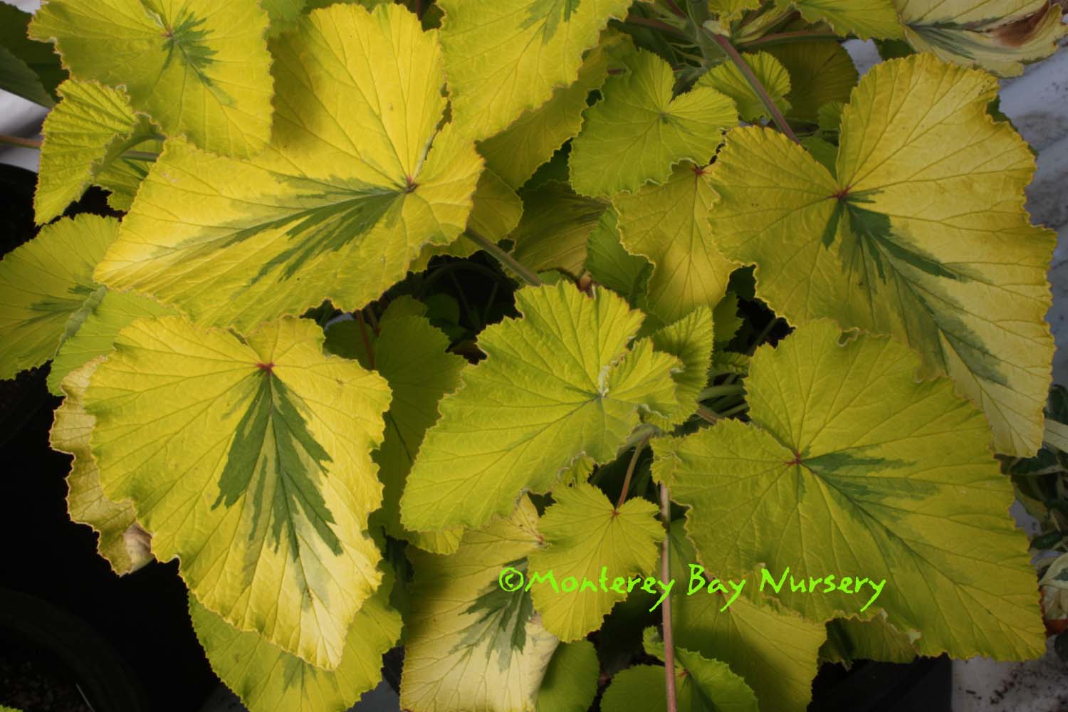 'Charity'  (not currently in production)  green plus creamy chartreuse  this is a really nice one. Nice big maple leaves of green and creamy yellow, pink flowers, and a wonderful citrus rose fragrance. This one can get to 3' tall or more and makes a good sized specimen for a container or a shrub in the garden. It is an excellent choice for display against a dark fence, stucco wall, rocks, railroad tie retaining walls, etc. The color changes with exposure, with higher contrast and lighter color in full sunlight. It tolerates shade very well and becomes more subtle and blended. Stems are long enough to use in flower bouquets. Sun or part shade, average to infrequent watering. Offer some protection from cold in winter if not in Sunset zones 8, 9, 14-24/USDA 9. rev 4/2012