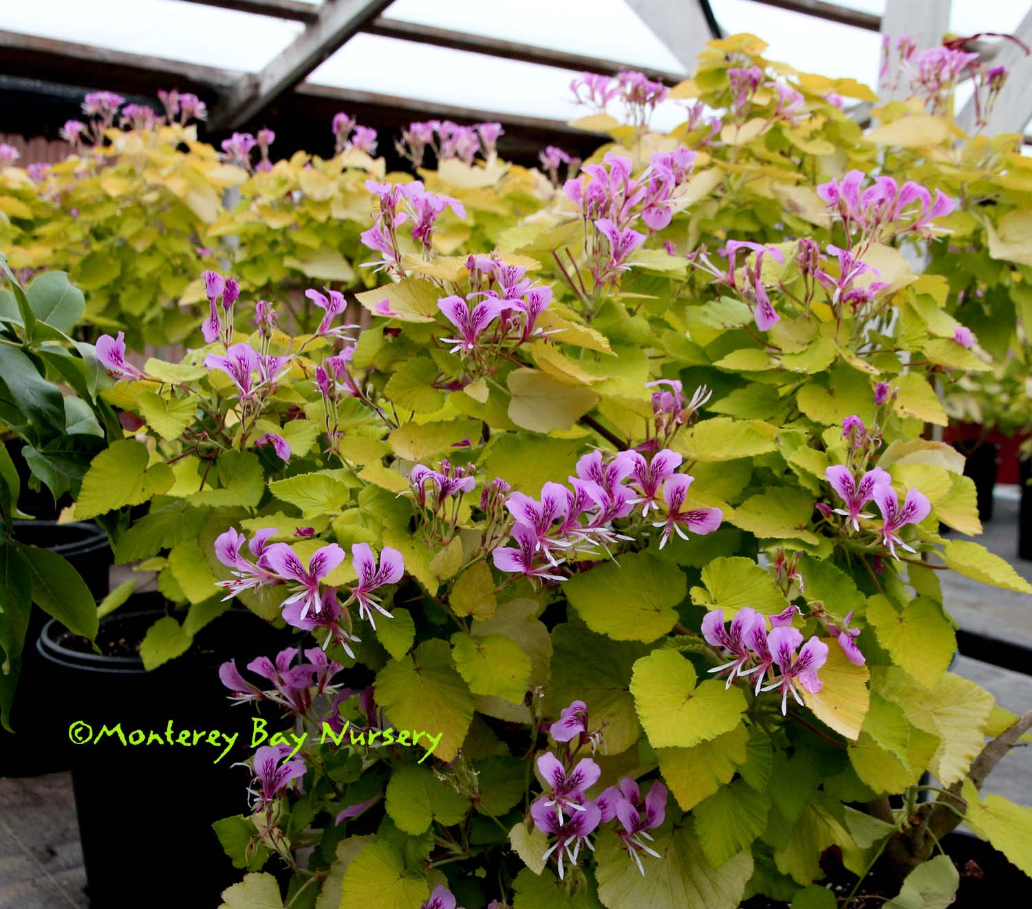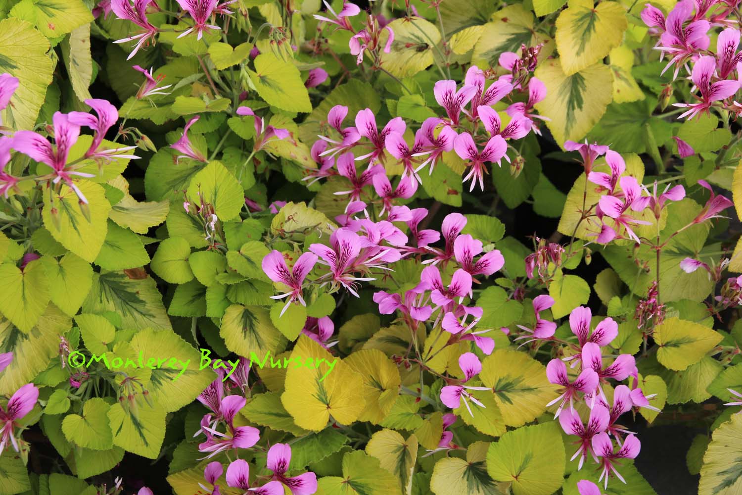 'Phyllis'  SCENTED GERANIUM (not currently in production)  so nice    an apricot fragrance, beautiful green and gold leaves, and reddish pink flowers with a white eye describe this one. So pretty even without the flowers! Reportedly a sport of 'Paton's Unique.' Wonderful in a container or will do in the garden with good drainage and average watering. Protect from hard freezes. Perennial in Sunset zones 8, 9, 12-24/USDA 9. rev 3/2013-Suzy Brooks