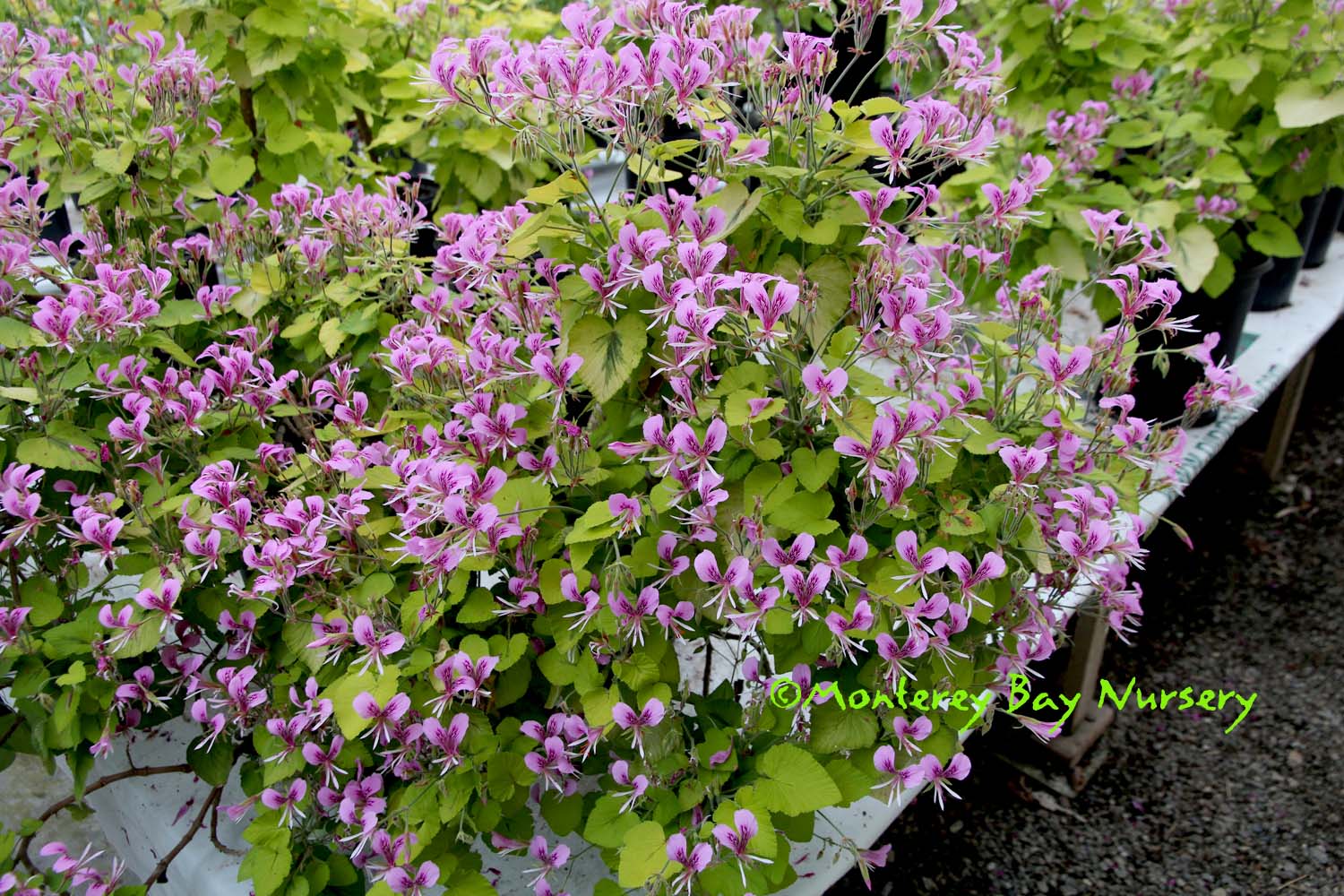Pelargonium  includes "Pels," Martha Washington geraniums, ivies and zonals, as well as a large number of true species ranging from rock garden subjects, fast trailing groundcovers, free standing shrubs, even succulents. Many have scented or ornamental foliage and/or good flower displays. Geraniaceae. rev 11/2011