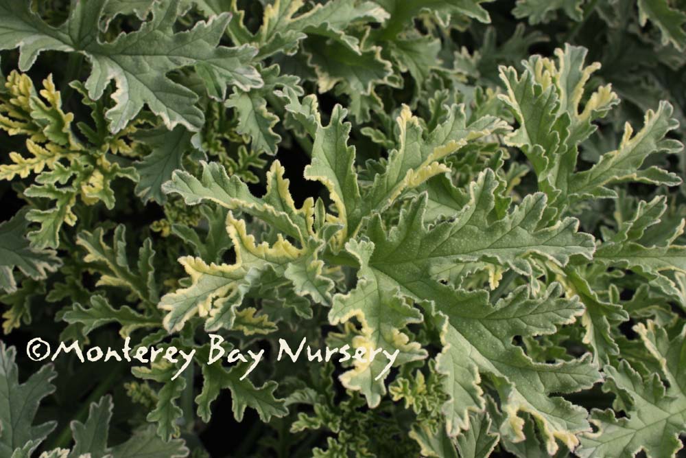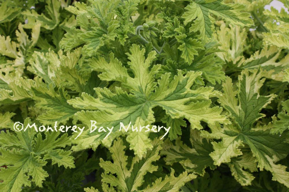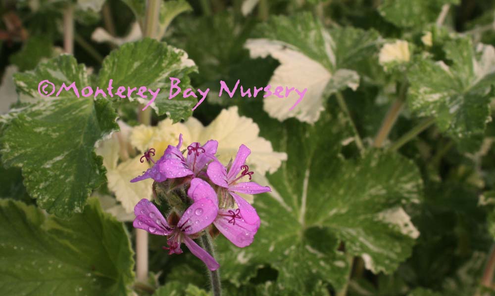 'Atomic Snowflake' (not currently in production)  fragrant too  large, light green leaves with creamy variegation are rose scented and it blooms with pink flowers in the summer. About 15" tall and spreading out 2-4' wide. Lovely in pots, along a fence or path where it can be brushed up against. Sun or part shade. Average watering. Protect from cold and frost outside Sunset zones 16-24/USDA 10.  rev 2/20214-Suzy Brooks