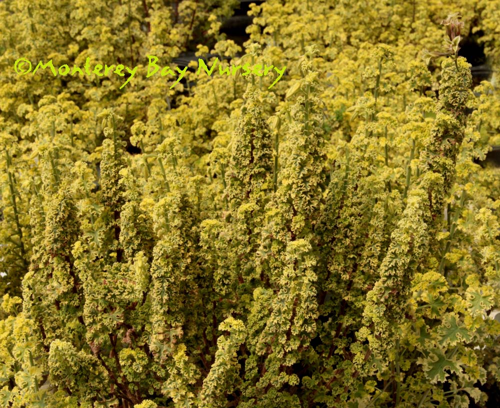 crispum 'Variegated Lemon' (not currently in production) foliage detail    many plants    a little shade   looks good from any angle!!    a really intriguing, slow, very vertical yet ultra-compact selection with minutely crinkly leaves, a very strong lemony leaf fragrance and very bright coloration. One of the very best foliage forms, just oustanding for small containers all by itself or for really lighting up a larger combo. Looks good against anything. Sun to more than half shade, typical drainage, forgiving on watering. Little or no frost. Flowers are small, at the tips of the vertical stems, light pink and open in late June. rev 6/2014