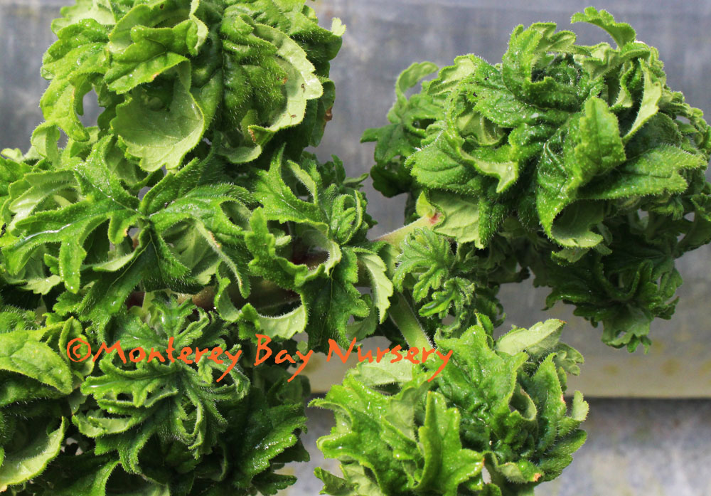 graveolens 'Colocho' (not currently in production)   twisted leaves   a very strange and ornamental variant with broadly palmate, rose-scented leaves that are twisted and curled against the stems. Easy but slow, special. Small pink flowers are similarly deformed and don't open. Get yours now! Full to part sun, not much frost, best displayed as a container plant. rev 3/2017