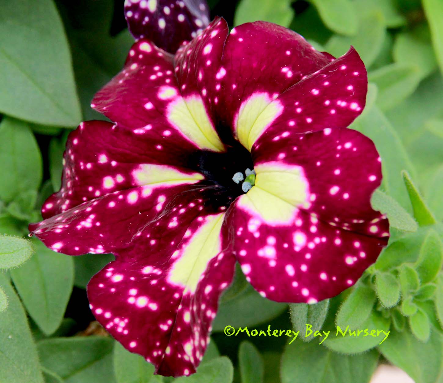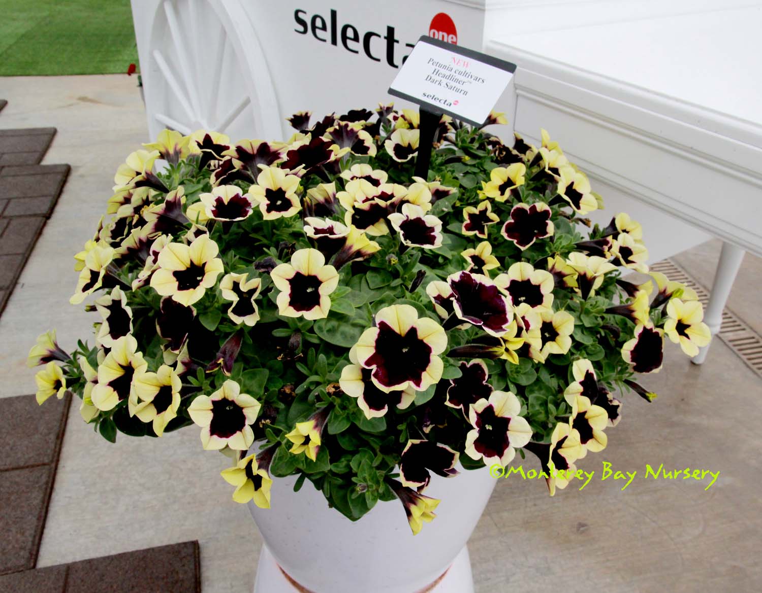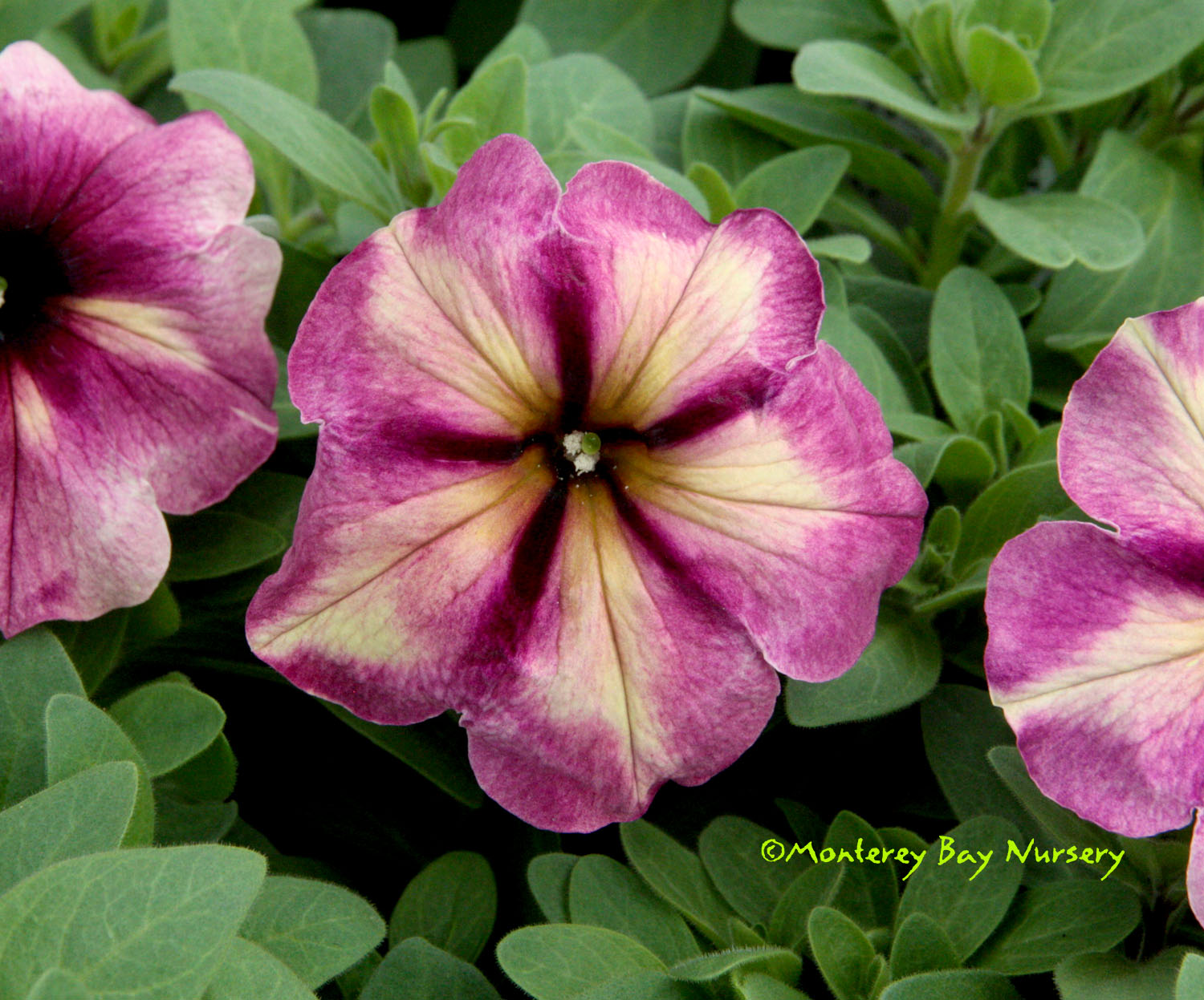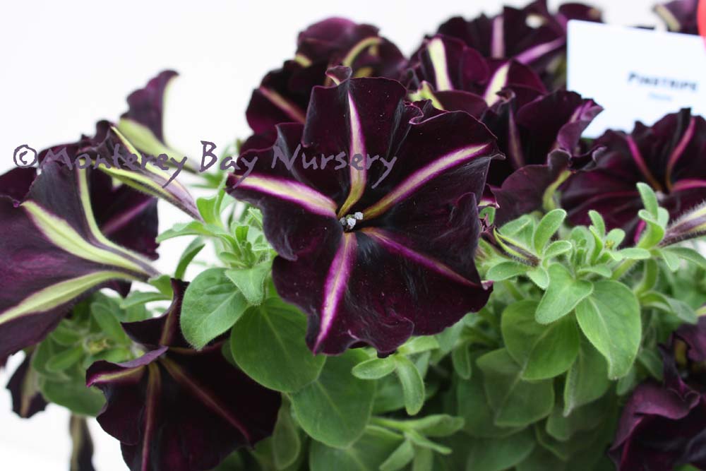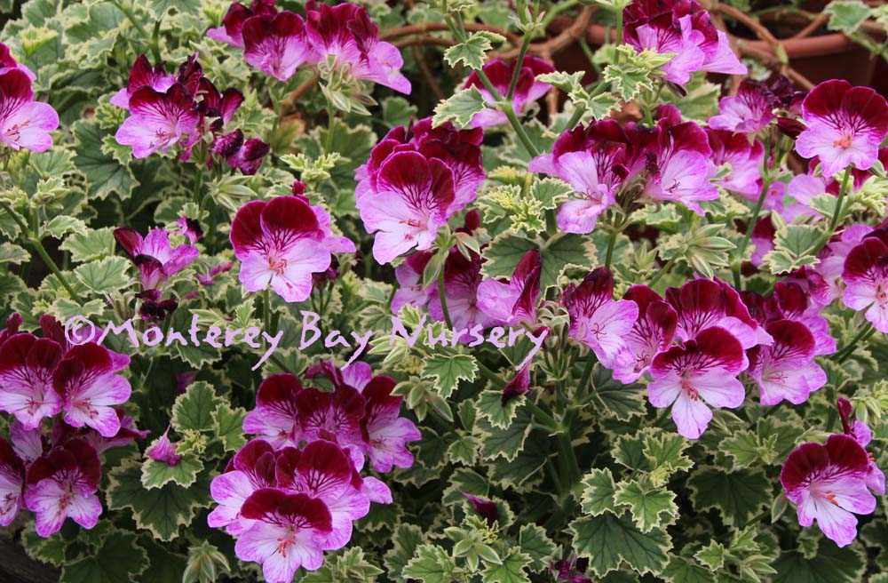 'Oldbury Duet' (not currently in production)  striking leaves and flowers   really pretty, and striking, with a two toned pansy face on handsome and very compact green and white leaves. This is a terrific container plant especially, or hanging basket,m for sun or part shade. To about 16" tall and wider, with either container planting mix or well drained soil, and average watering. Grow anywhere, but protect from frost outside Sunset zones 8, 9, 14-24/USDA 8. rev 12/2013
