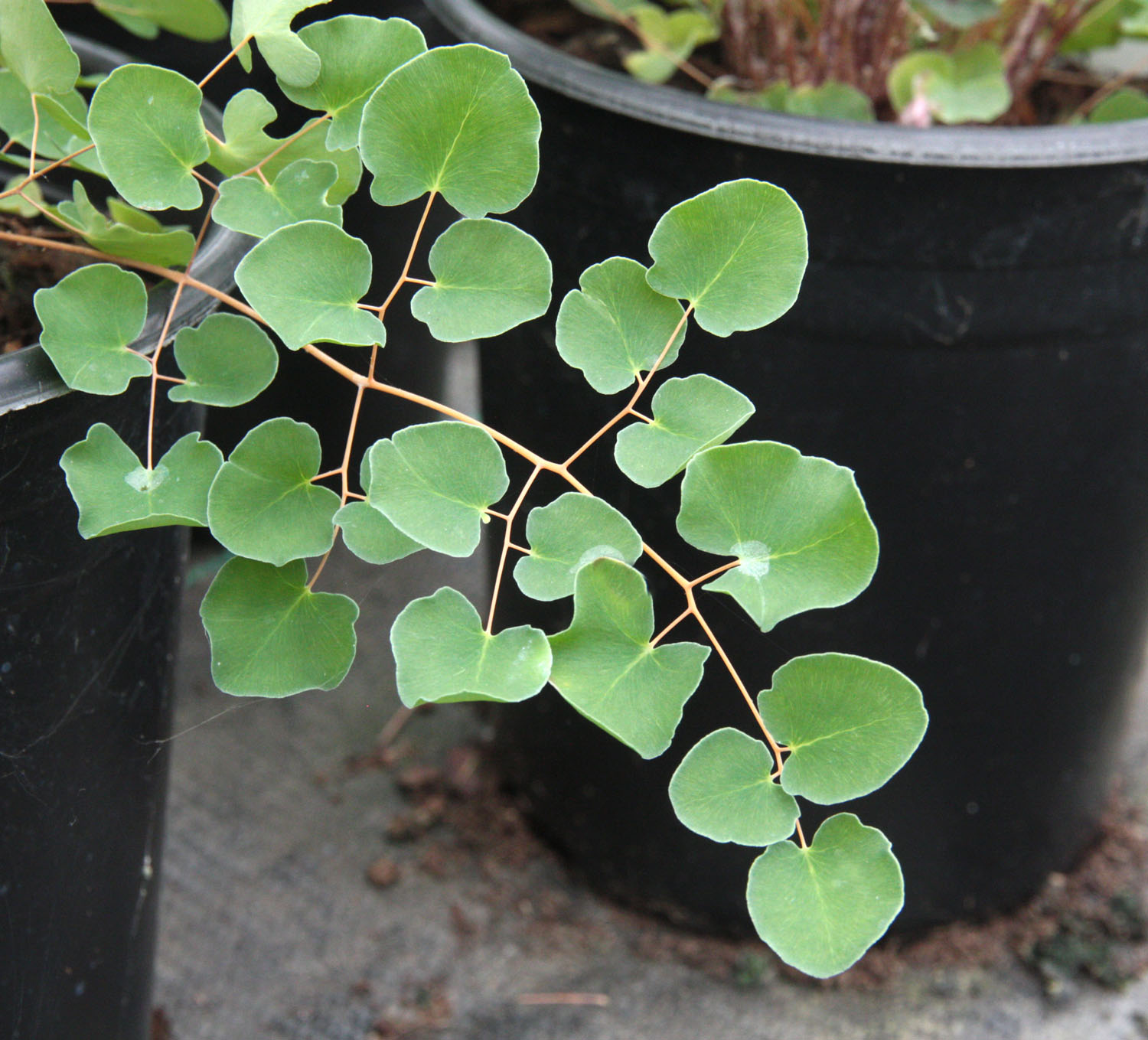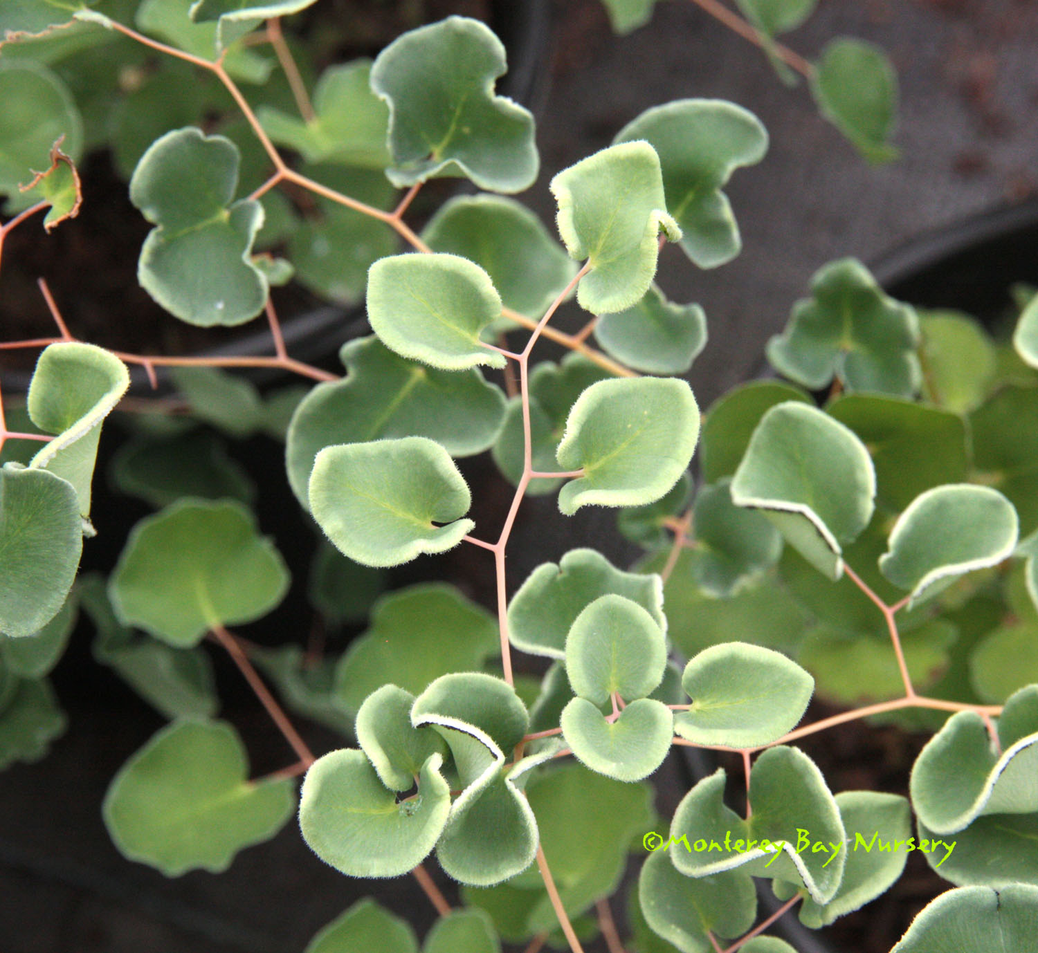 rotundifolia  BUTTON FERN  mature foliage and habit  small, low evergreen fern to 1’ tall, 2’ wide. This species has been a staple of the trade here for generations. Bipinnate fronds grow to 10" long, with small, glossy, very dark green round pinnae closely held against the midribs. It is found as an understory groundcover beneath trees and scrub in its native New Zealand and dislikes continuously moist conditions. Those characteristics help make it a good California landscape performer, tolerating dry periods between waterings and demonstrating tolerance and resilience as a container plant indoors or out. Will take some direct sun to full shade sites and needs average to infrequent watering. Deciduous below 25°F. New Zealand. rev 6/2020
