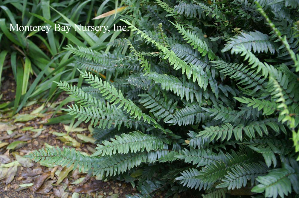Polystichum  evergreen ferns (usually), forming rosettes with often quite regular, circular shapes, at least initially. Best known through our own native Western Sword Fern, P. munitum, below. Polypodiaceae. rev 1/2017