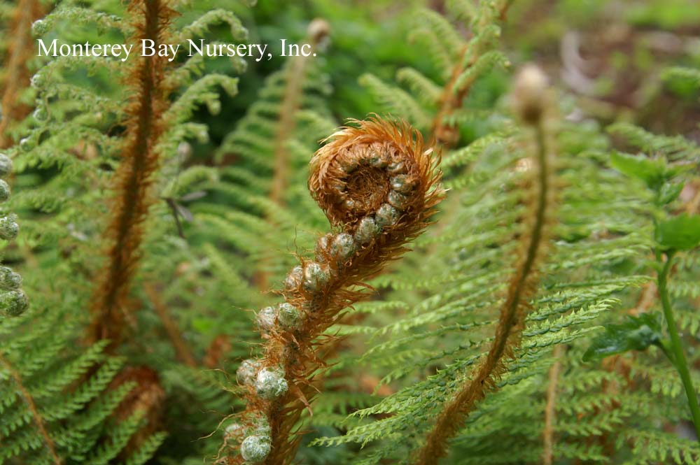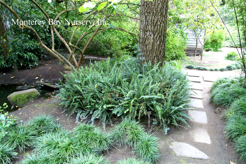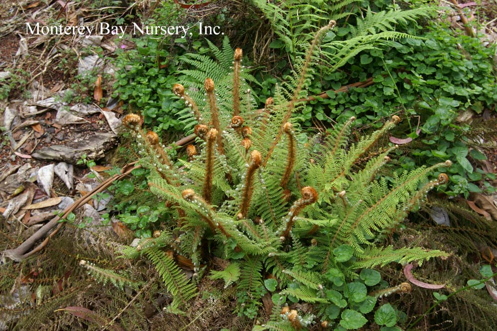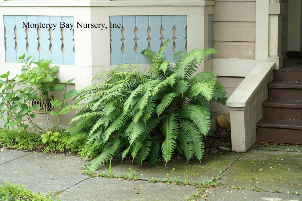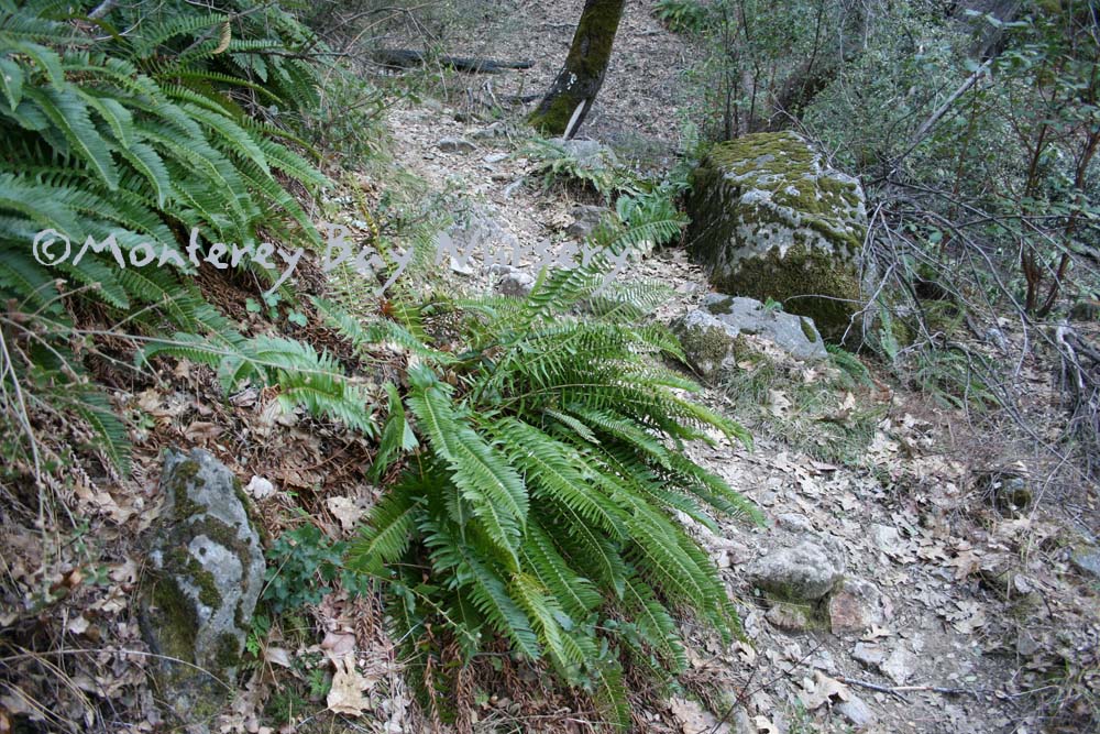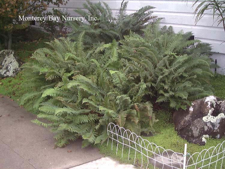 munitum  WESTERN SWORD FERN   wild, Santa Lucia Mountains    wild, Mystery Spot    garden landscape   another formal specimen  this evergreen fern produces neat upright pinnate fronds, reaching 4-5’ tall in the moist, cool forests of northern California but usually lower, to around 2', especially in hotter areas without summer watering. Great in dry shade landscapes, especially to give the illusion of a lush, moist garden where little water is actually being used. Also looks great used with other native shade plants like Asarum, Woodwardia,or when planted among redwoods. Needs part sun to dense shade and is best with some summer watering. Use peat moss for soil prep when planting, mulch around the crowns to keep the soil moist and cool. To groom wait for the new croziers to swell in late winter before cutting last year's fronds off close to the crown. Frost hardy for all of California but the High Sierras and east of the Cascades. Polypodiaceae. rev 1/2010