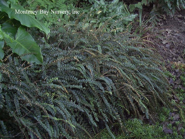 lingua JAPANESE FELT FERN  Stybing Arboretum groundcover   confined   slow, creeping, spreading growth, with leathery dark green frond blades to 8" long or more held on wiry petioles. Mature fronds become densely patterned with sori when producing spores. Total height on mature plantings is around 12" or so, 18" if crowded, and spreading slowly to cover a decent amount of ground. We offer the following forms: