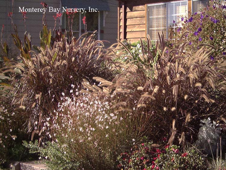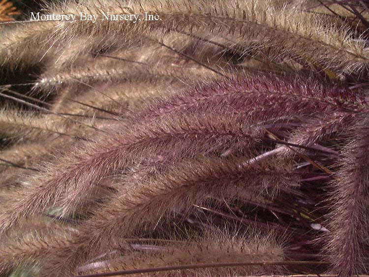 setaceum ‘Cupreum’  PURPLE FOUNTAIN GRASS  flowers closeup  Lake Merritt centerpiece  mixed  spreading growth to 3-6’ tall and wide if not restrained by yearly or seasonal pruning. Produces multitudes of softly fuzzy flower heads, emerging light burgundy and aging to tan, held above dark burgundy leaves and stems in summer. Partially winter deciduous. Supposedly not invasive in most areas. rev 9/2020