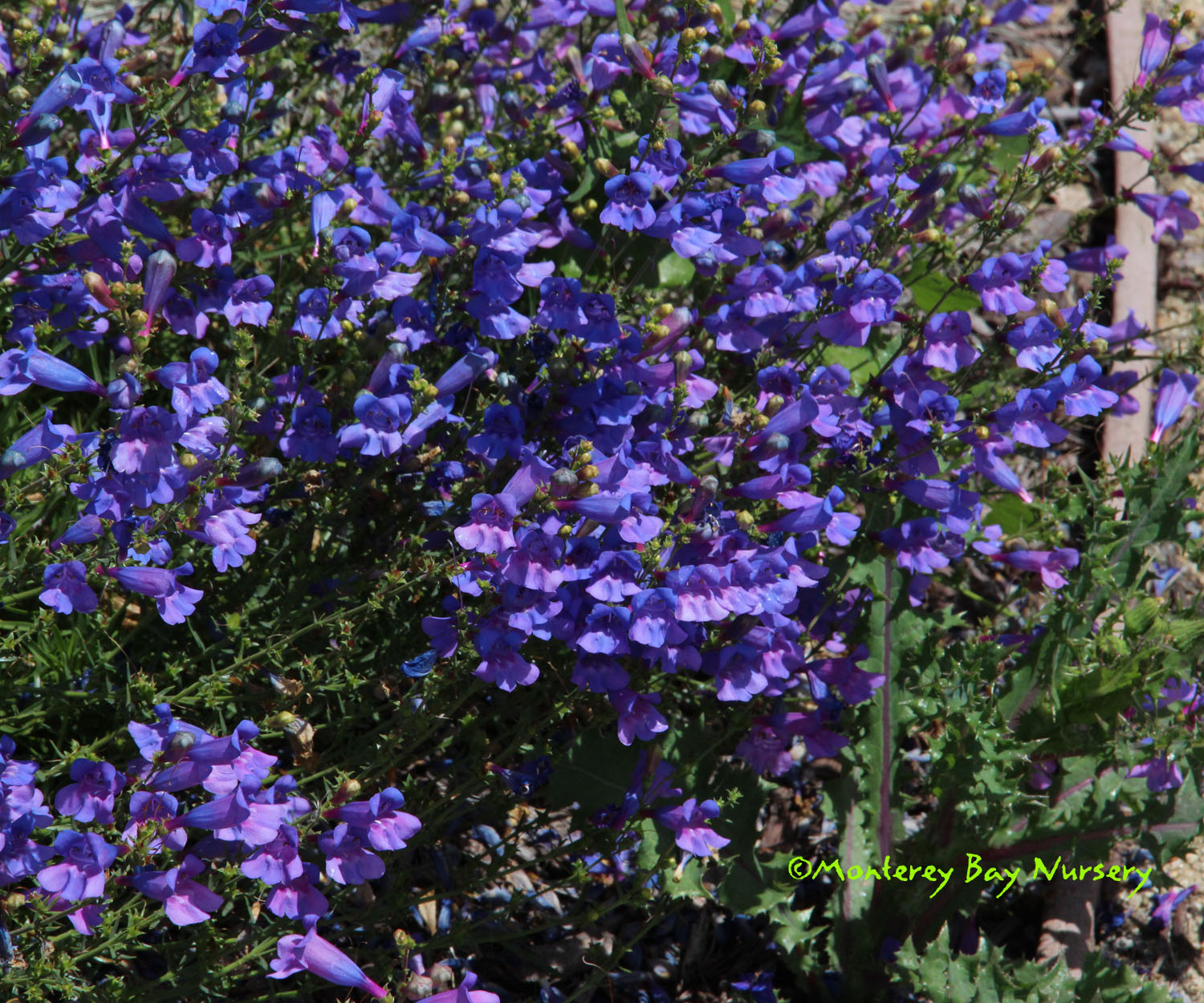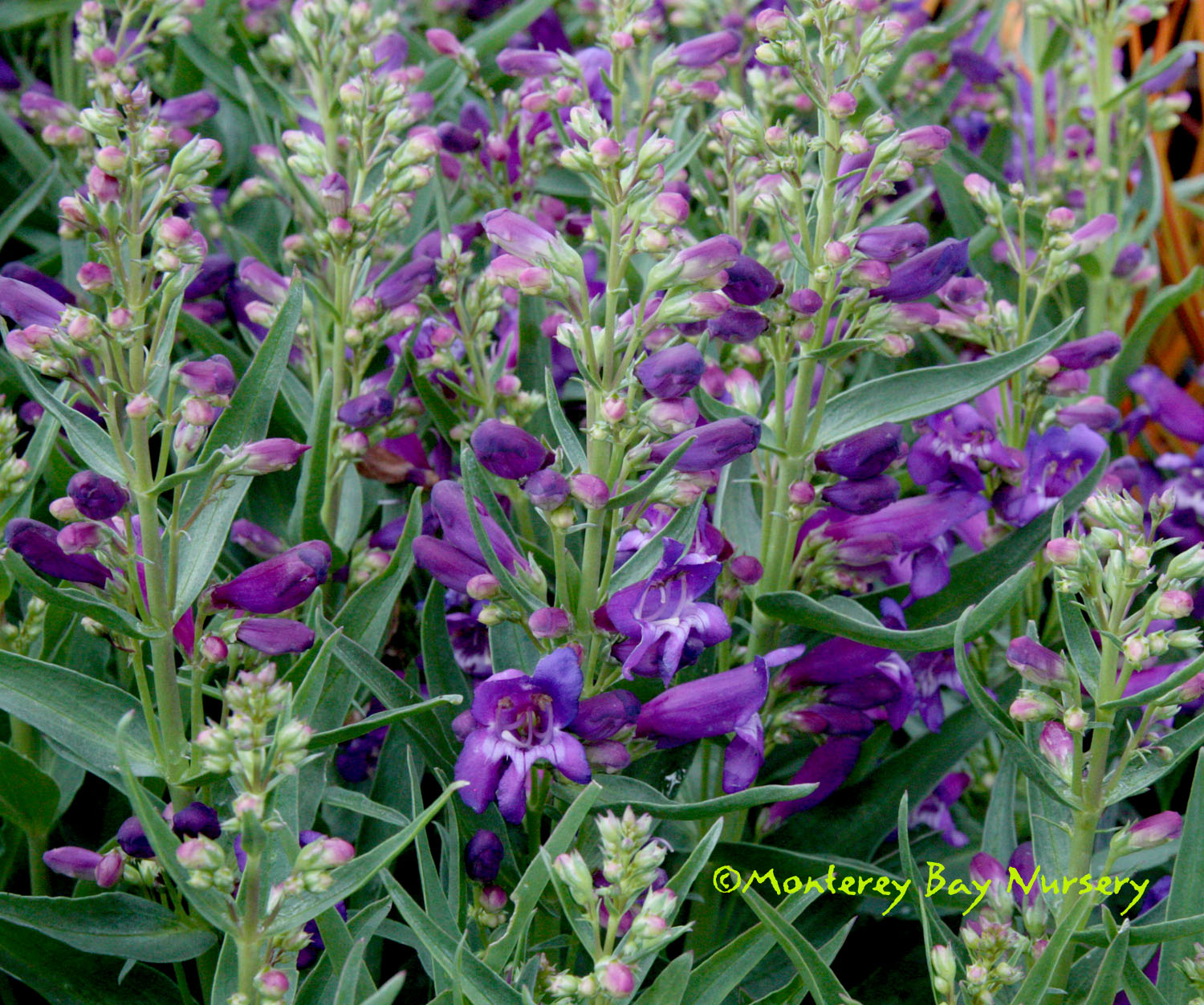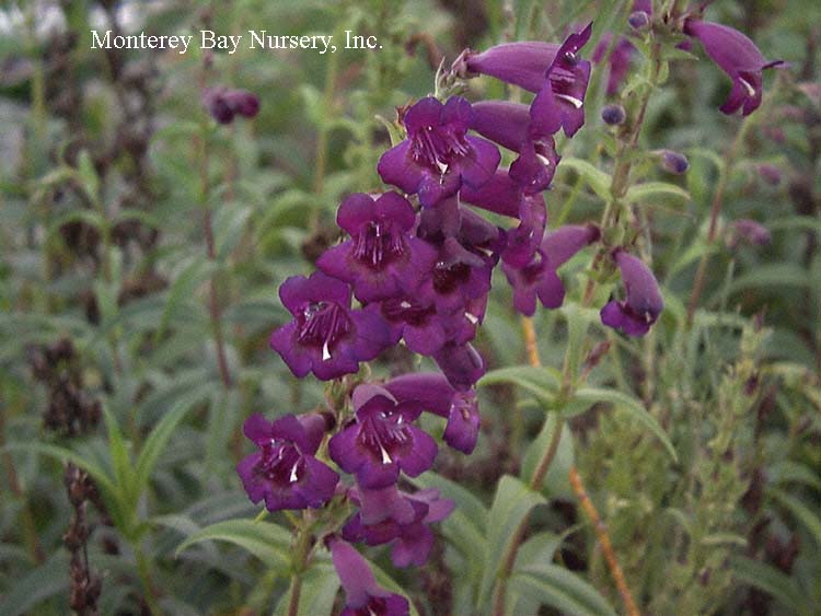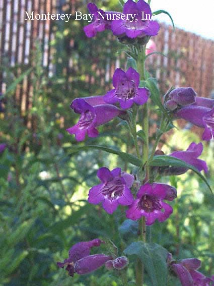 'Blue Springs'  FOOTHILL PENSTEMON   this form is a nice medium blue aging towards violet, which is typical. The young flowers buds are pale yellow, leaves are light green with a silvery sheen. This can easily bloom through the summer in cool, foggy areas. This and other forms are often propagated from seed, at least occasionally, leading to a fair degree of unintended domestication selection. That means it will tolerate more watering and pampering than its wild-population kin without dying, or at least living longer before doing so. To about 18" tall by 2' wide if happy. Sun to part shade (grow drier), average to good drainage, cut back old flower heads to extend both bloom season and plant lifespan. rev 4/2021