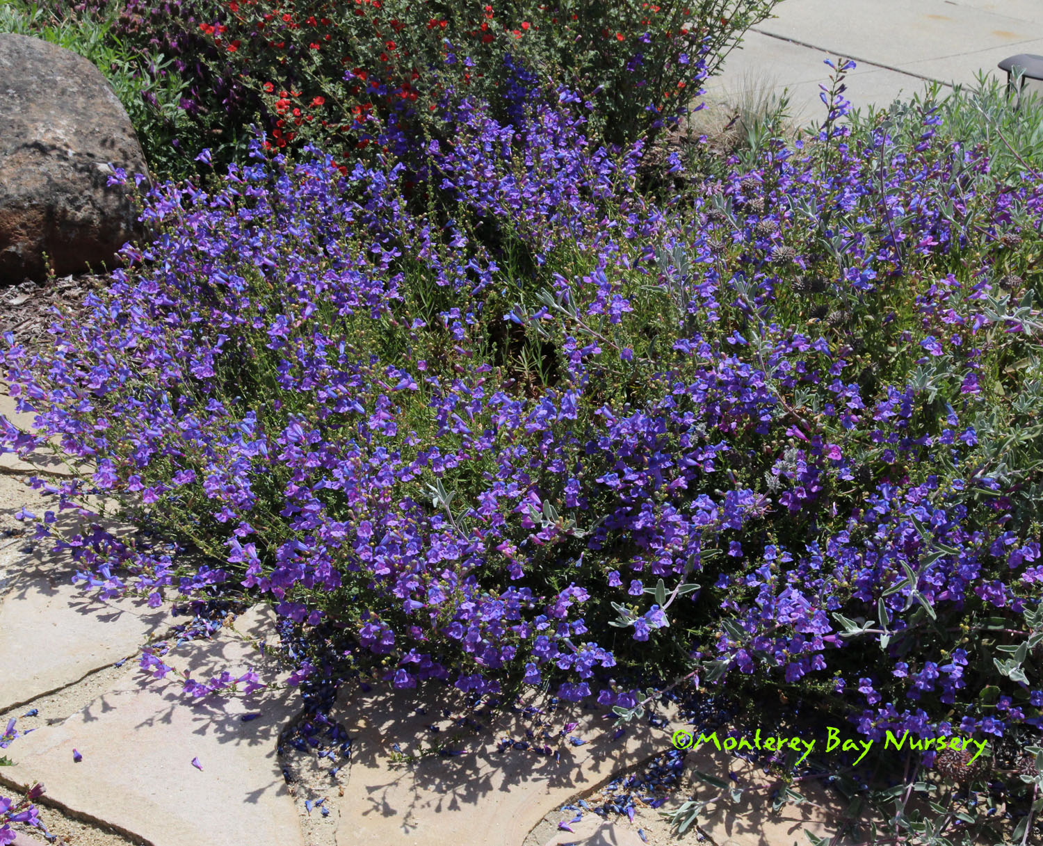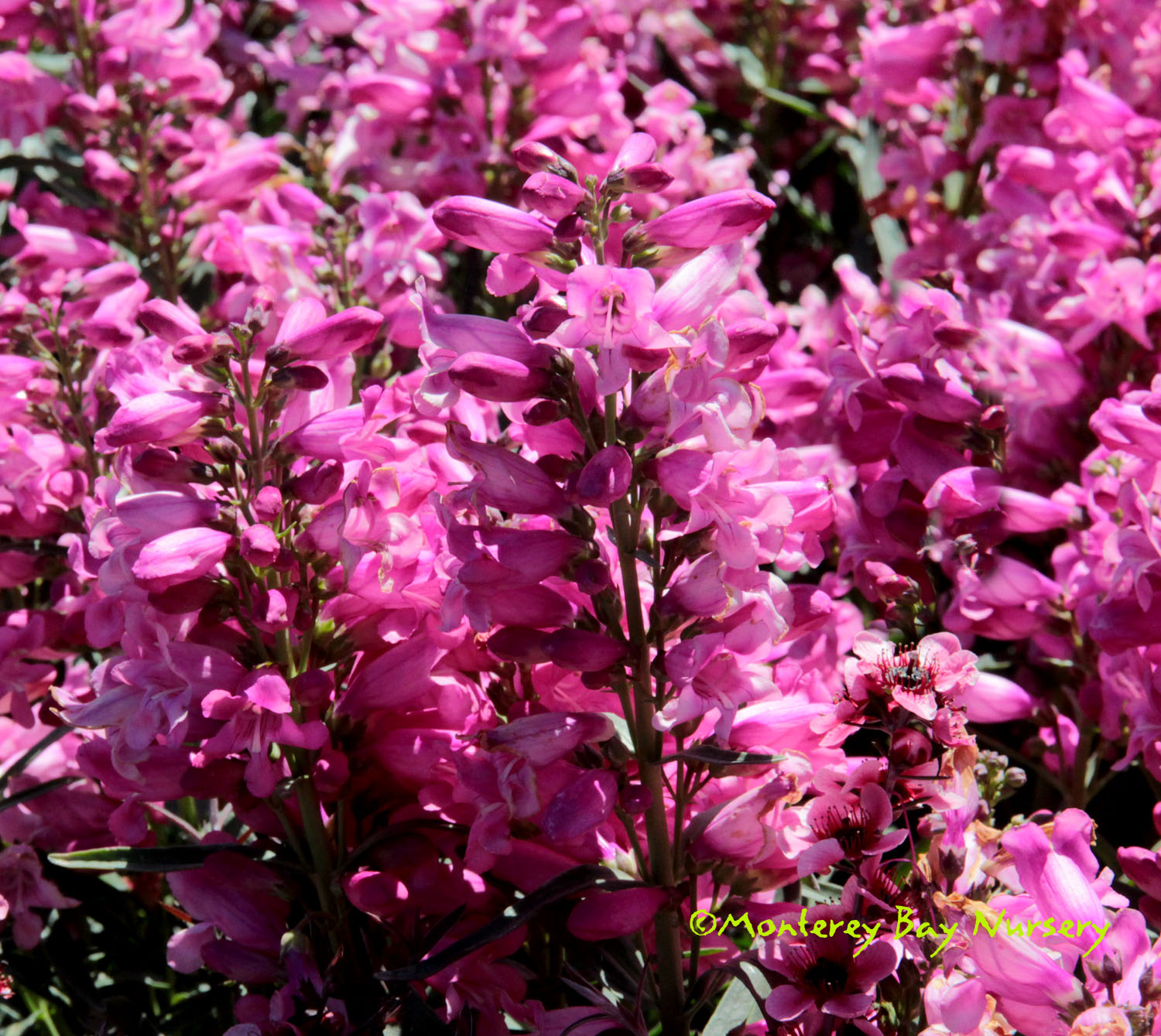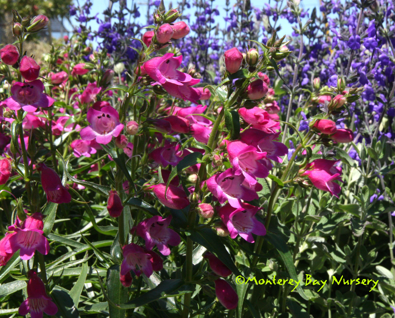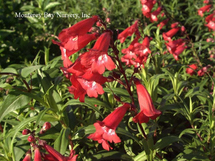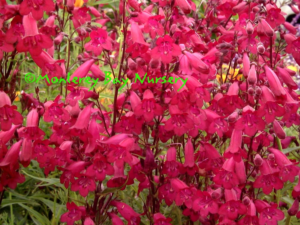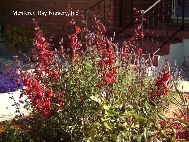 'Garnet'   massed flowers   nice plant   tubular dark violet red flowers on terminal spikes are heavily produced from spring through fall against relatively fine textured, dark green leaves. An easy, tough, evergreen perennial that will bring hummingbirds and butterflies to your garden. Mixes and combines well with other perennials, grasses, lavenders, Echinaceas, yarrows, and even Aeoniums. This is a durable, showy, garden and landscape subject that can tolerate dry conditions and even heavy soils as long as it gets at least half a day of sun and some supplemental summer watering. It will tolerate abuse reliably enough to be used in many commercial landscape applications. To about 2-3' tall by 4-5' wide unpruned, evergreen for most of populated California. Sun to mostly shade. rev 6/2014