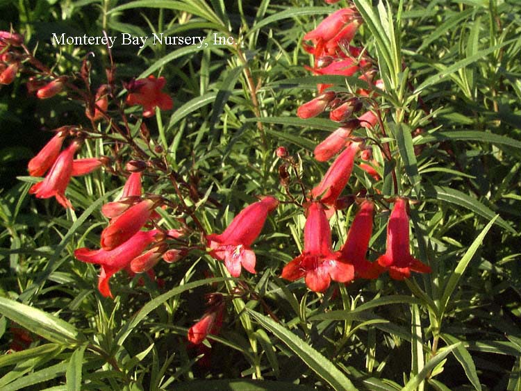 barbatus   SOUTHWESTERN PENSTEMON  a compact, mostly evergreen woodland to montane species with narrow, dark green leaves forming a mound 1-3' tall by about half as wide. Produces compact spikes of usually coral red to red orange tubular flowers from spring through early summer in wild populations. This species has co-evolved with hummingbirds as pollinators (at least partially) so expect this to be a good way to draw them in to your garden. Sun to part shade, good drainage, average to modest watering, frost hardy to USDA zone 4.