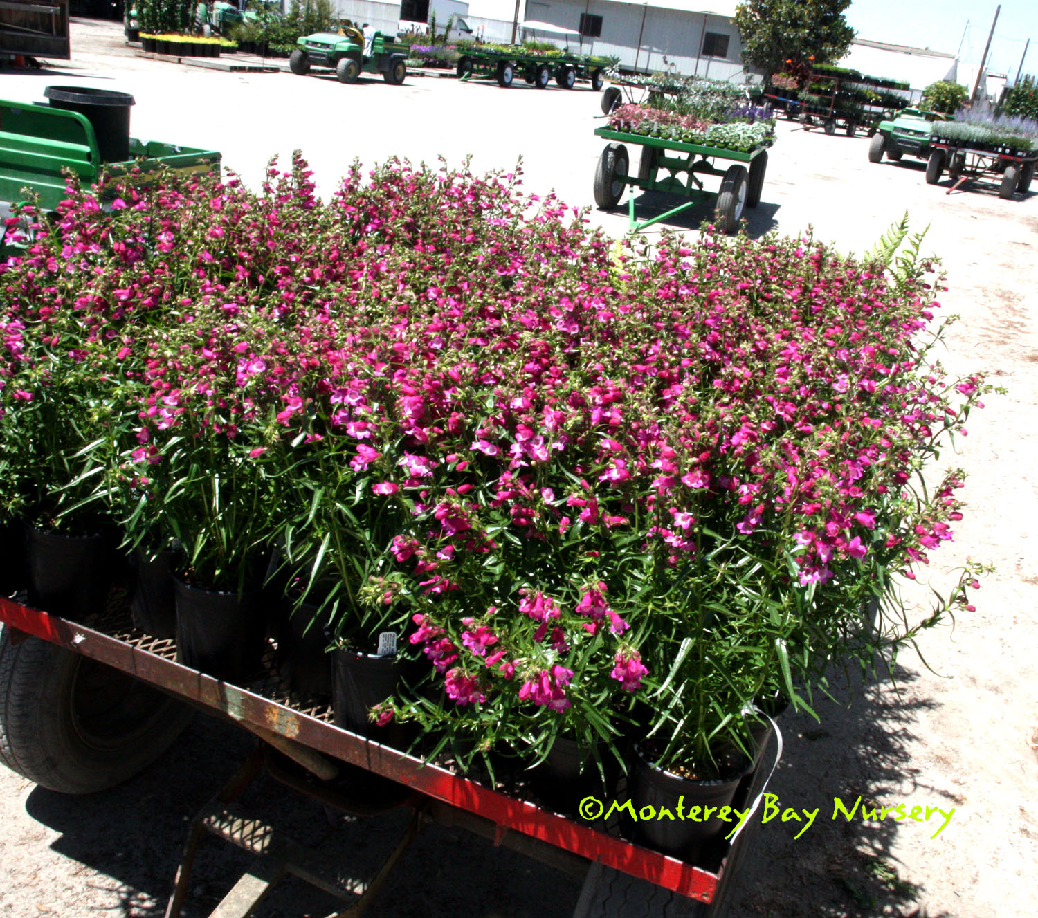 'Red Rocks'  whole trailer full    closeup   a hybrid named after cliffs west of Denver, this hybrid resembles 'Garnet' but is more compact. It's also probably more winter-hardy for those few living in really cold-winter areas of California. Deep rose red flowers with lighter throats are produced from late spring through late summer or early fall here in our climate. Deep green leaves are long and narrow. To about 18" tall and spreading as a clump to a couple of fee across when happy, likes full sun of course, at least average drainage and modest watering when established. USDA zone 4. rev 7/2021