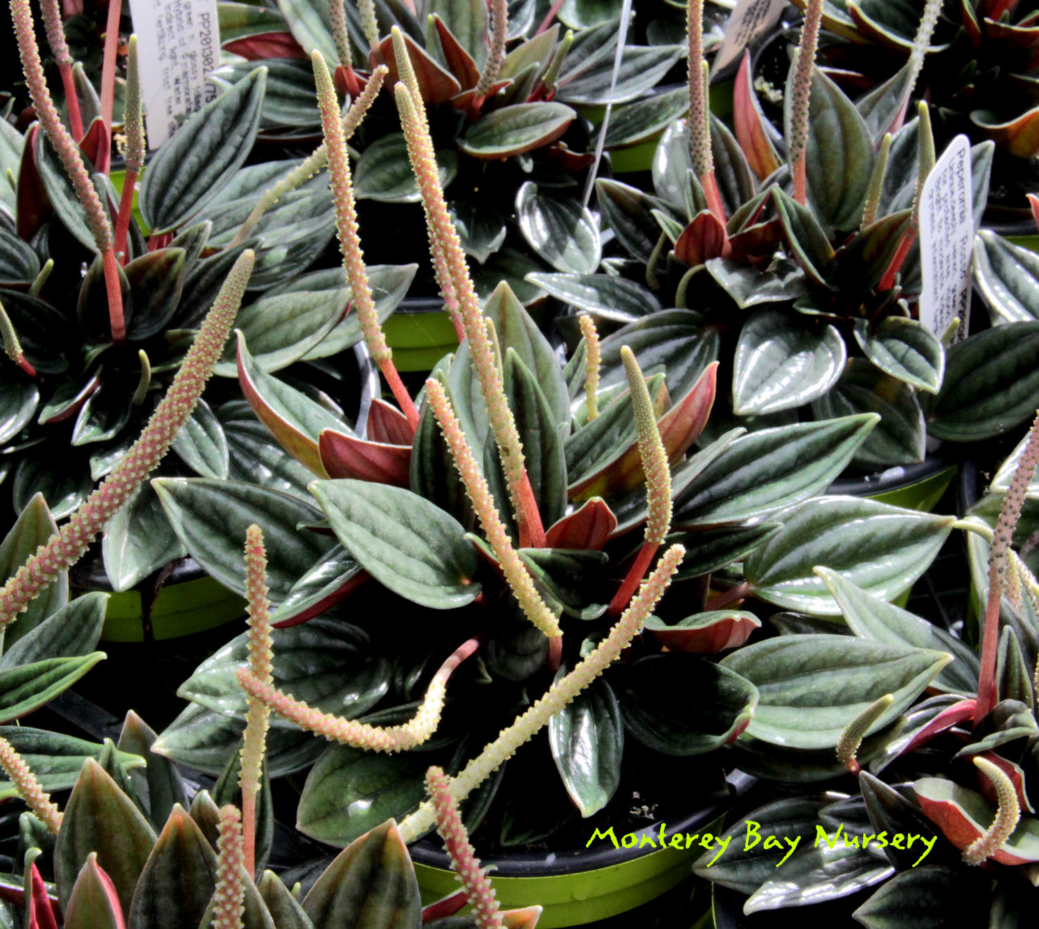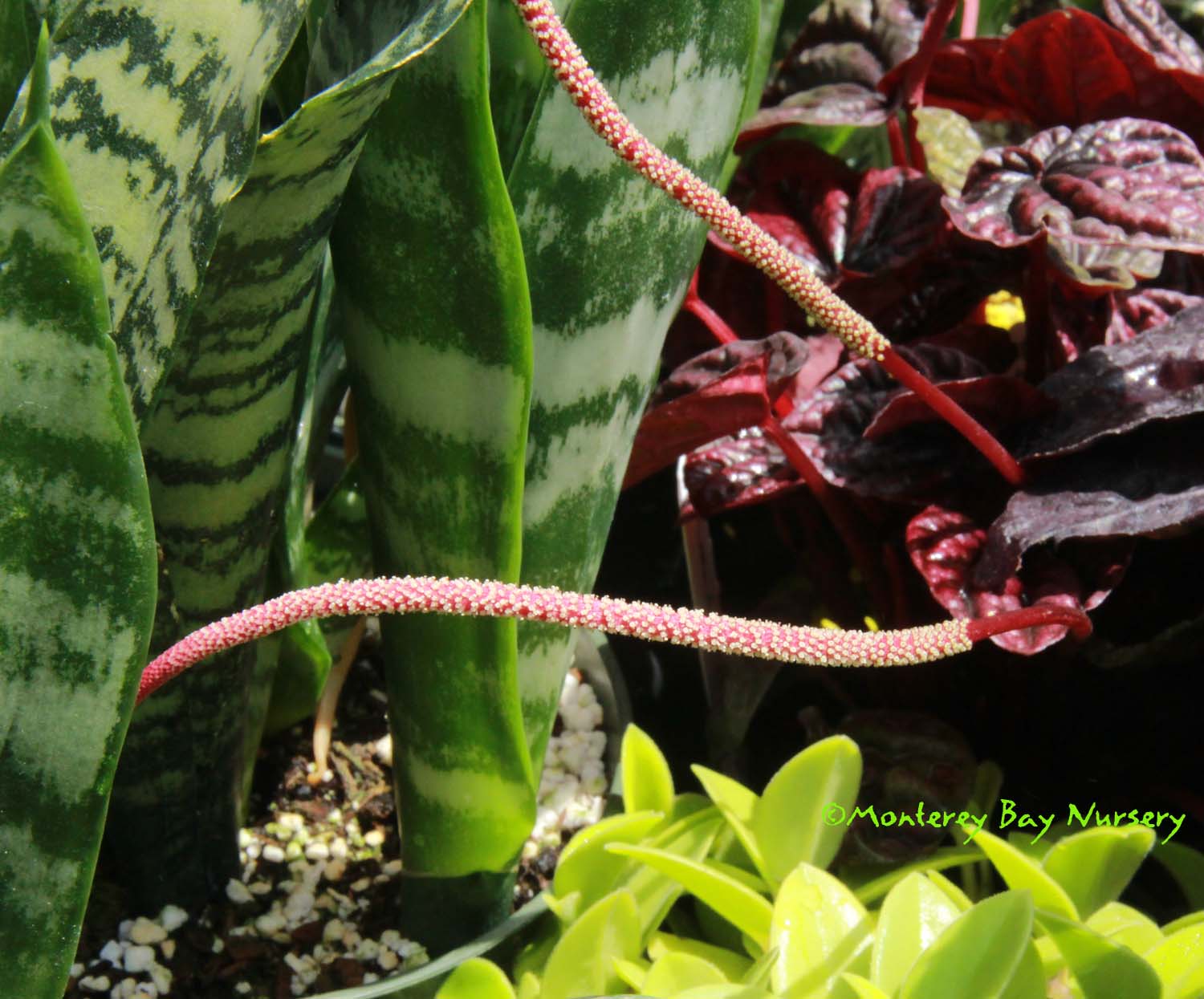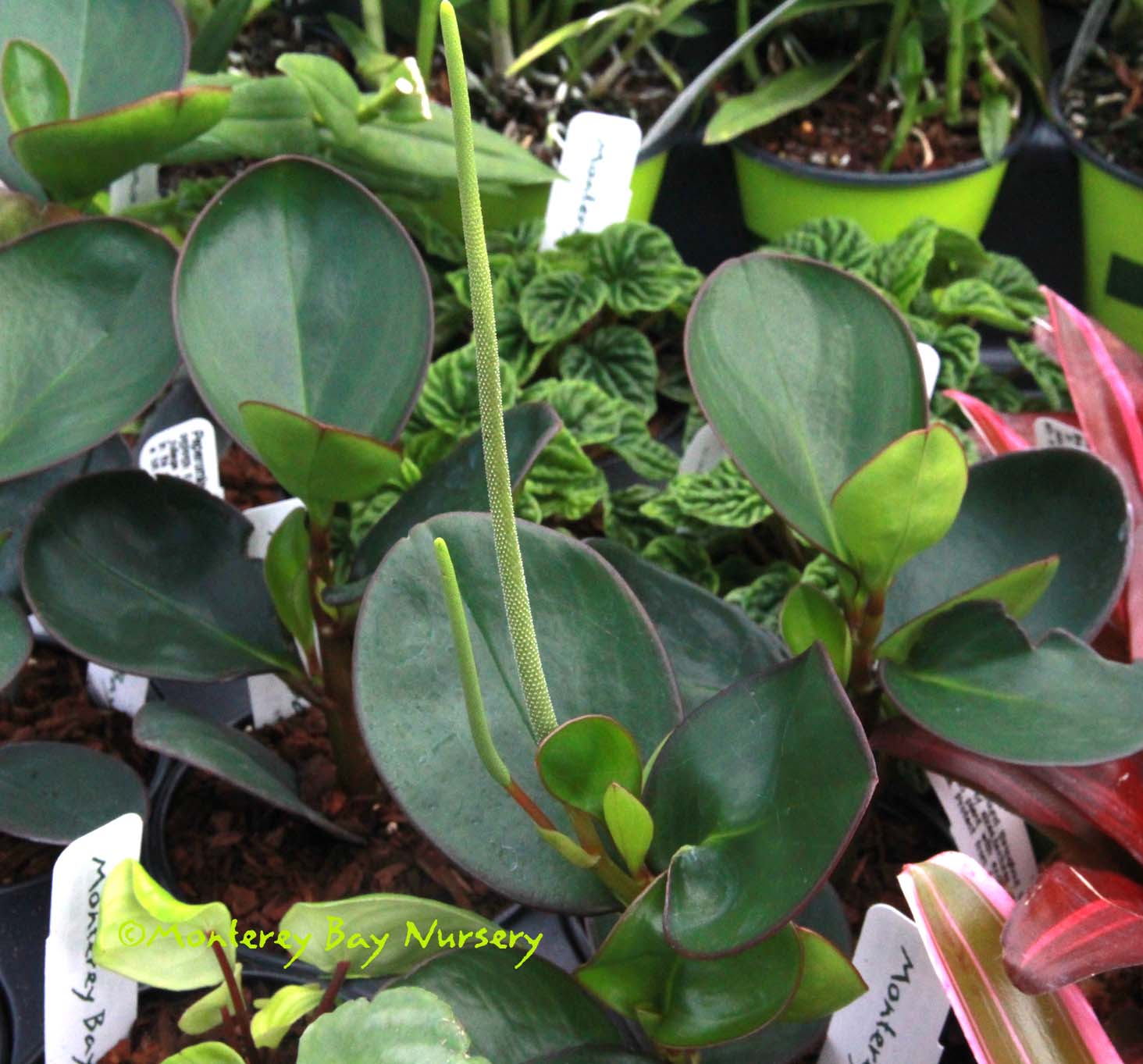 Peperomia    a genus of over 1500 species of herbaceous evergreen perennials, groundcovers and soft-wooded subshrubs. Many are partially succulent in nature but most  horticultural varieties have been introduced for their interesting and variable leaves and habits. Flower spikes are narrow and quite thin, often snaky, held above or among the leaves. Flowers themselves are minute. Most species are native to Central or South America but the genus is distributed worldwide throughout the tropics. It is an extremely early family of flowering plants grouped with the Magnoliids (Magnolias, Laurels, Pipers, etc.) and thus is neither a Monocot (grasses, lilies, orchids etc.) nor a Dicot (such as oaks, daisies, Petunias etc.). Piperaceae. rev 5/2020