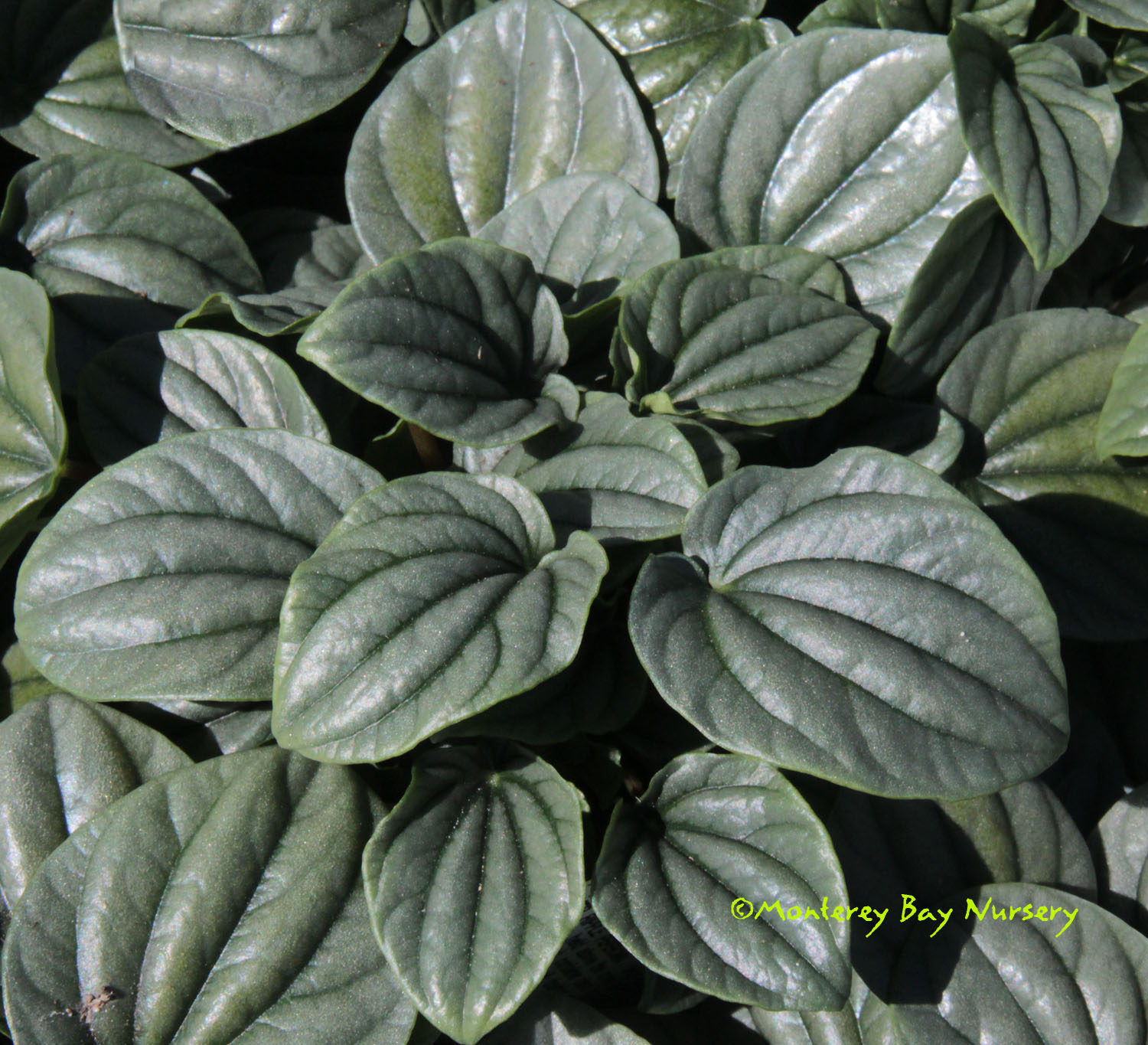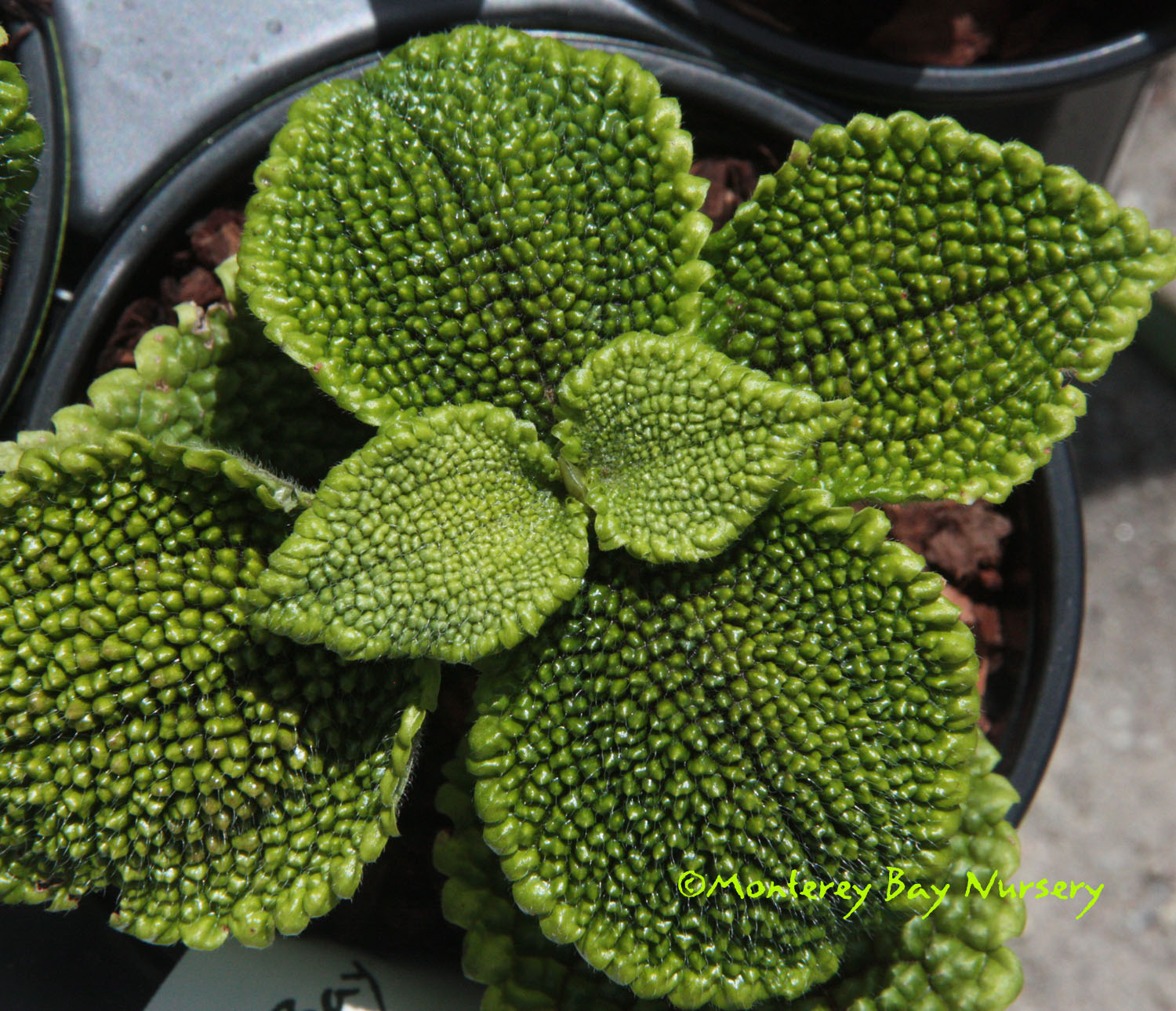 'Frost'  four inch pot, juvenile phase  modestly corrugated leaves, grey green, with a shiny, metallic, Raku-like sheen that becomes frosty white on mature leaves in high-light conditions. Avoid direct midday sun. rev 5/2020