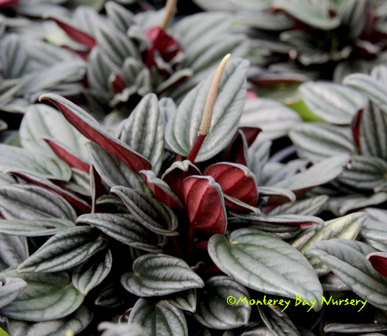 argyreia  WATERMELON PEPEROMIA  named for its coloration and shape of its leaves. Oval leaves become cupped and teardrop-shaped as they ages, and are marked with broad silvery stripes between the leaf veins. Red petioles and flower stalks provide nice contrast. To see the best color you'll have to limit the amount of bright light it receives - too much causes it to turn uniformly yellow-green. To about 8" tall and wide. RHS Award of Garden Merit. Northern South America. rev 5/2020