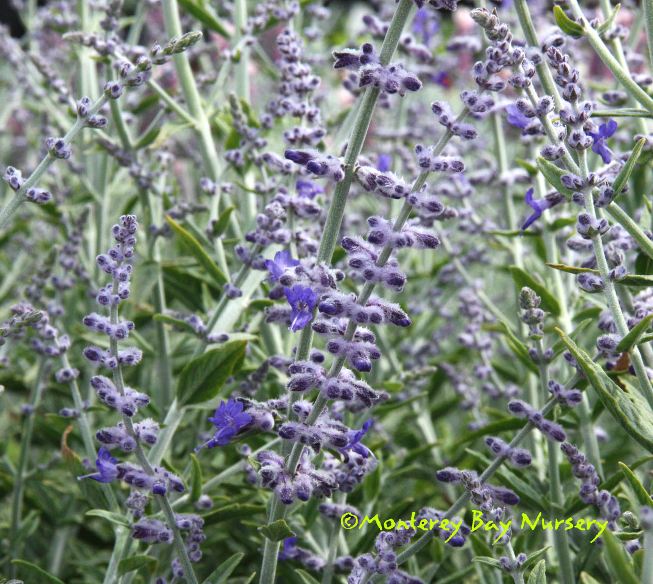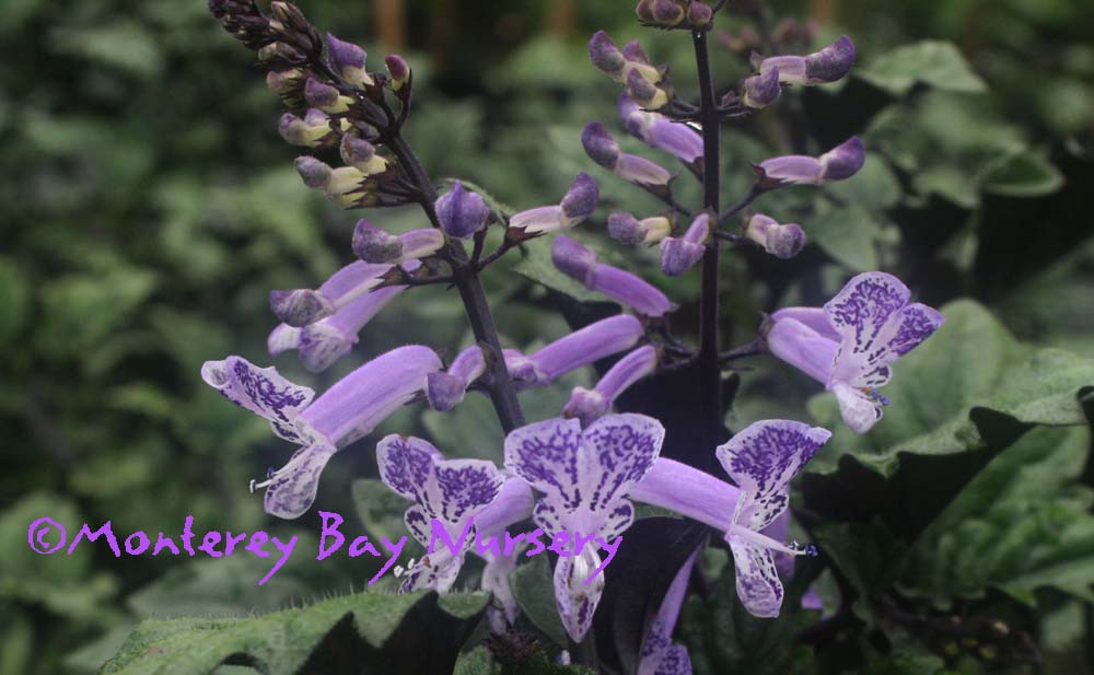 'Mona Lavender'   (not currently in production)   foliage  a compact, shrubby, relatively soft-wooded hybrid , perennial sage relative grown mostly for its striking deep green, fuzzy foliage with wonderful dark purple undersides. A nice foliage plant, it also features light lavender flowers usually from early fall through spring if untouched by frost.  My wife Molly loves it, for the dark green and purple, the beautifully contrasting and complimentary light lavender blue flowers, its ability to survive on neglect (she kept forgetting to water it, it kept blooming), and the amount of payback contained in such a small package. "As pretty as Coleus, as tough as Aspidistra" she said. This selection was frozen to the ground at 25F in our 2007 spring freeze but regrew by the following winter. Facultative short day bloom. Sun to full shade, average to infrequent watering watering. rev 2/2009
