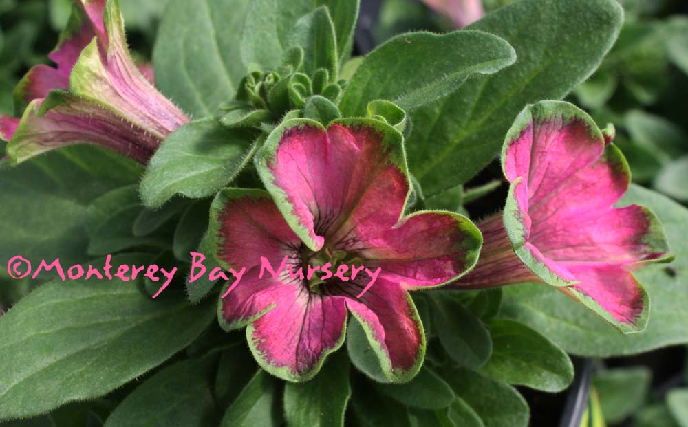 'Angel Eyes Picotee'  (not currently in production)  charming   little pansy-faced flowers of pink and red violet on top of crinkly leaves are just too cute! A miniature, to only 10-12" tall and wide. Litttle mounds make a nice little hedge around the herb garden and delightful container subjects. Sun or part shade, regular watering. Protect from cold outside Sunset zones 8, 9, 12-24/USDA 8. rev 4/2012-Suzy Brooks
