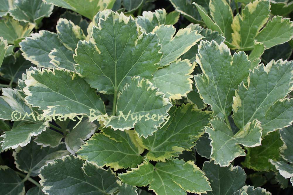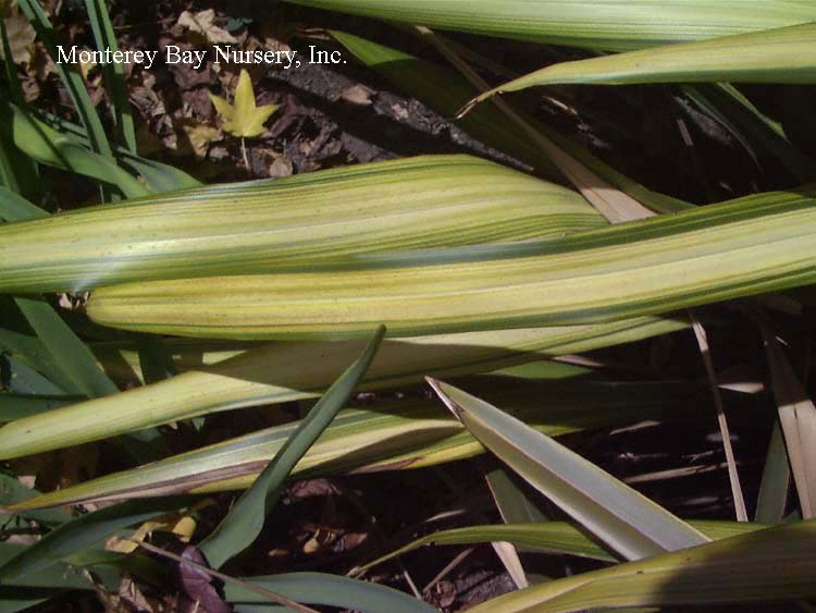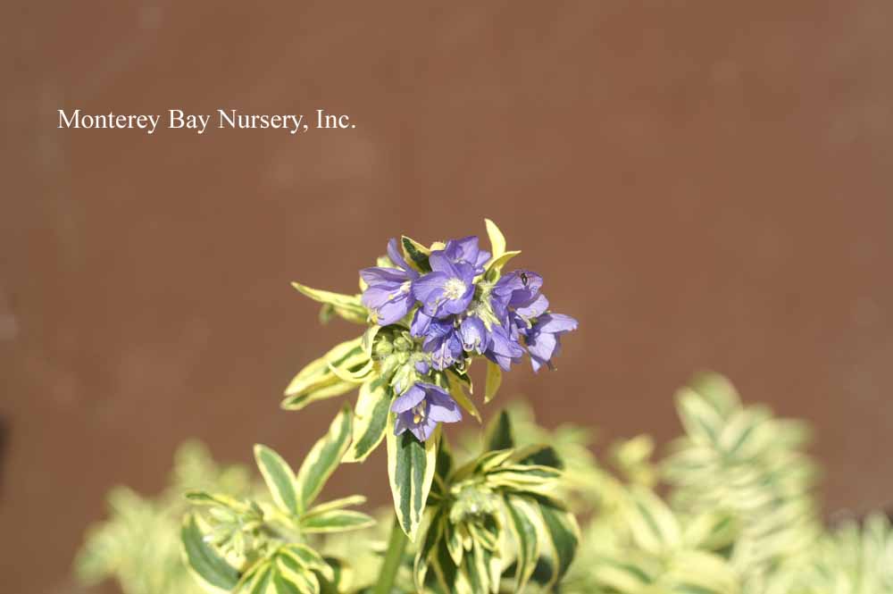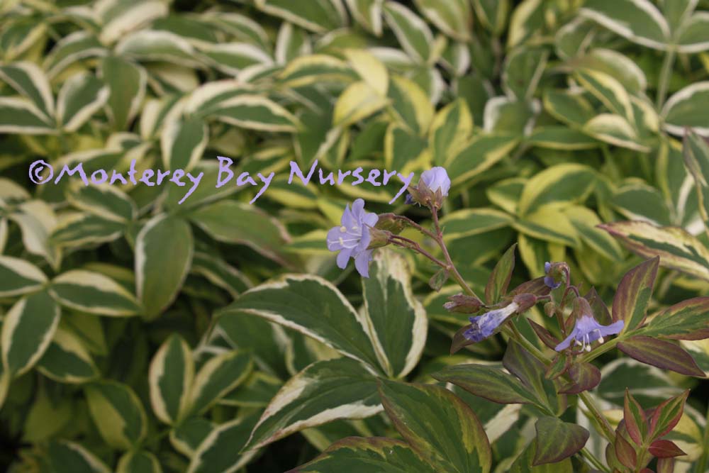 'Stairway to Heaven'  blooming   foliage effect  this is a larger textured, variegated foliage form to about 18" tall that bears pale lavender blue flowers atop the cream-edged folaige. In cool weather the foliage picks up a light wine colored tint. Sun to mostly shade, average watering, very frost hardy. Sunset zones 5-9, 14-17, 21-24/USDA zone 5. rev 7/2009