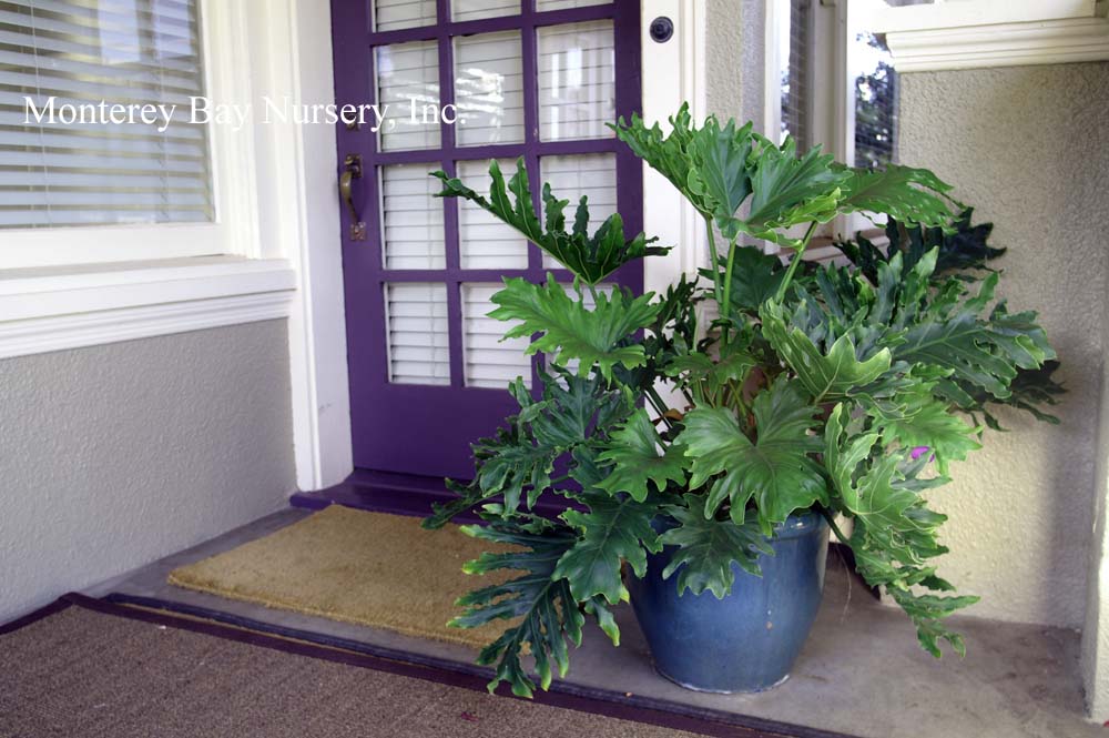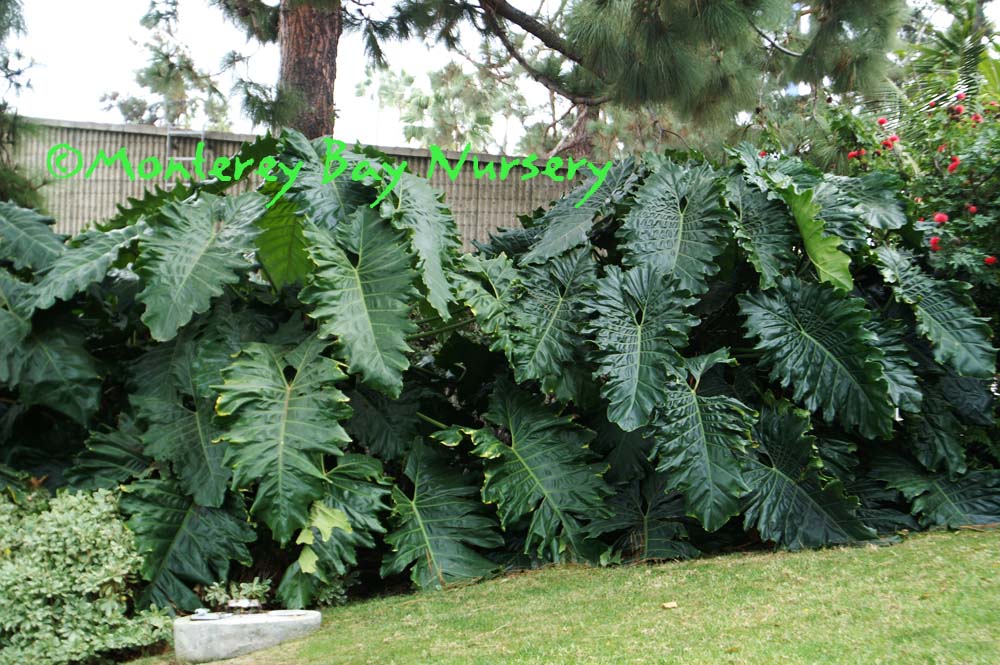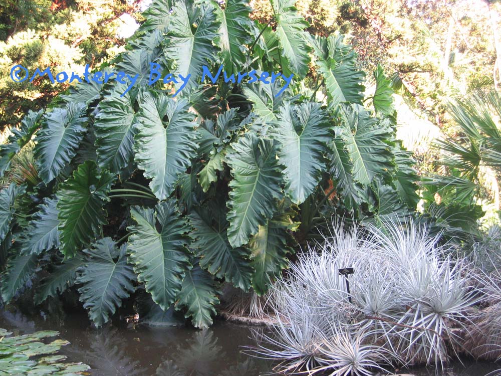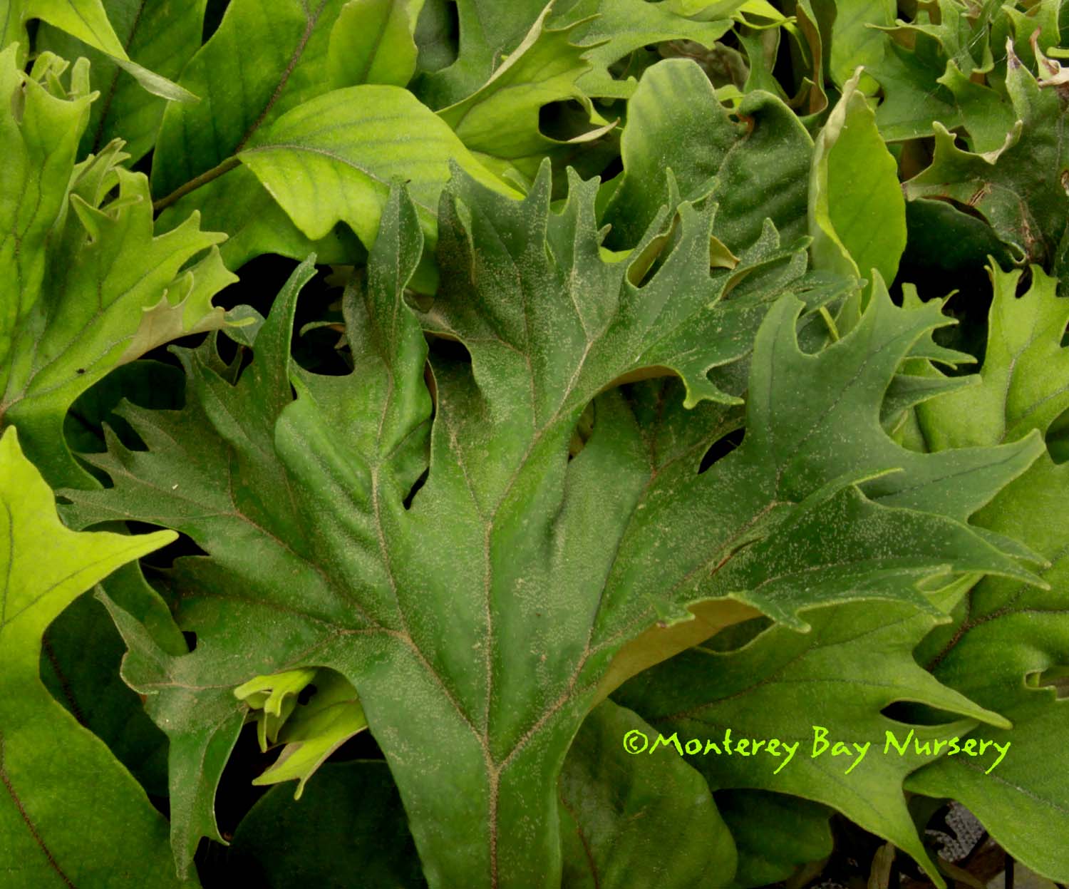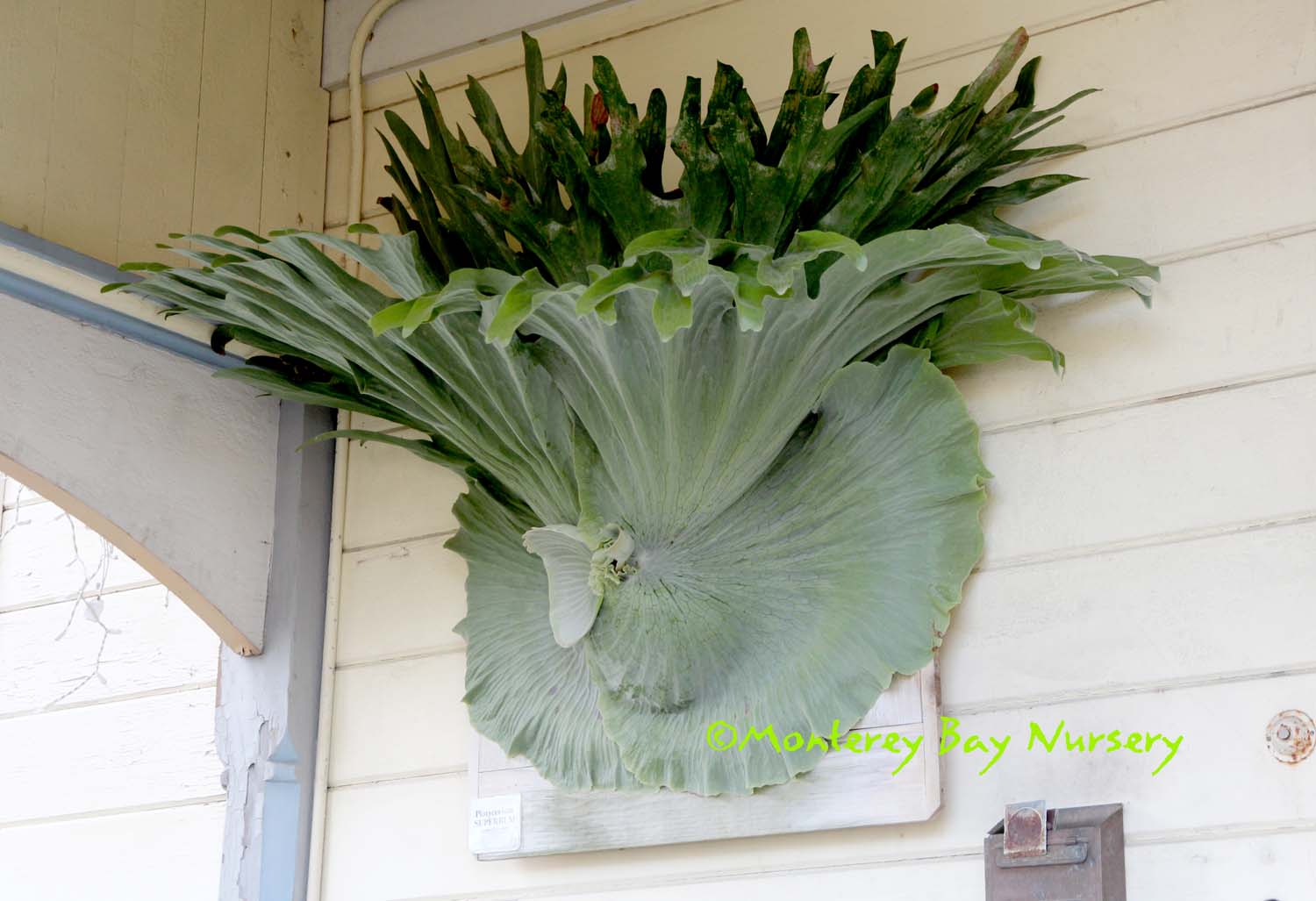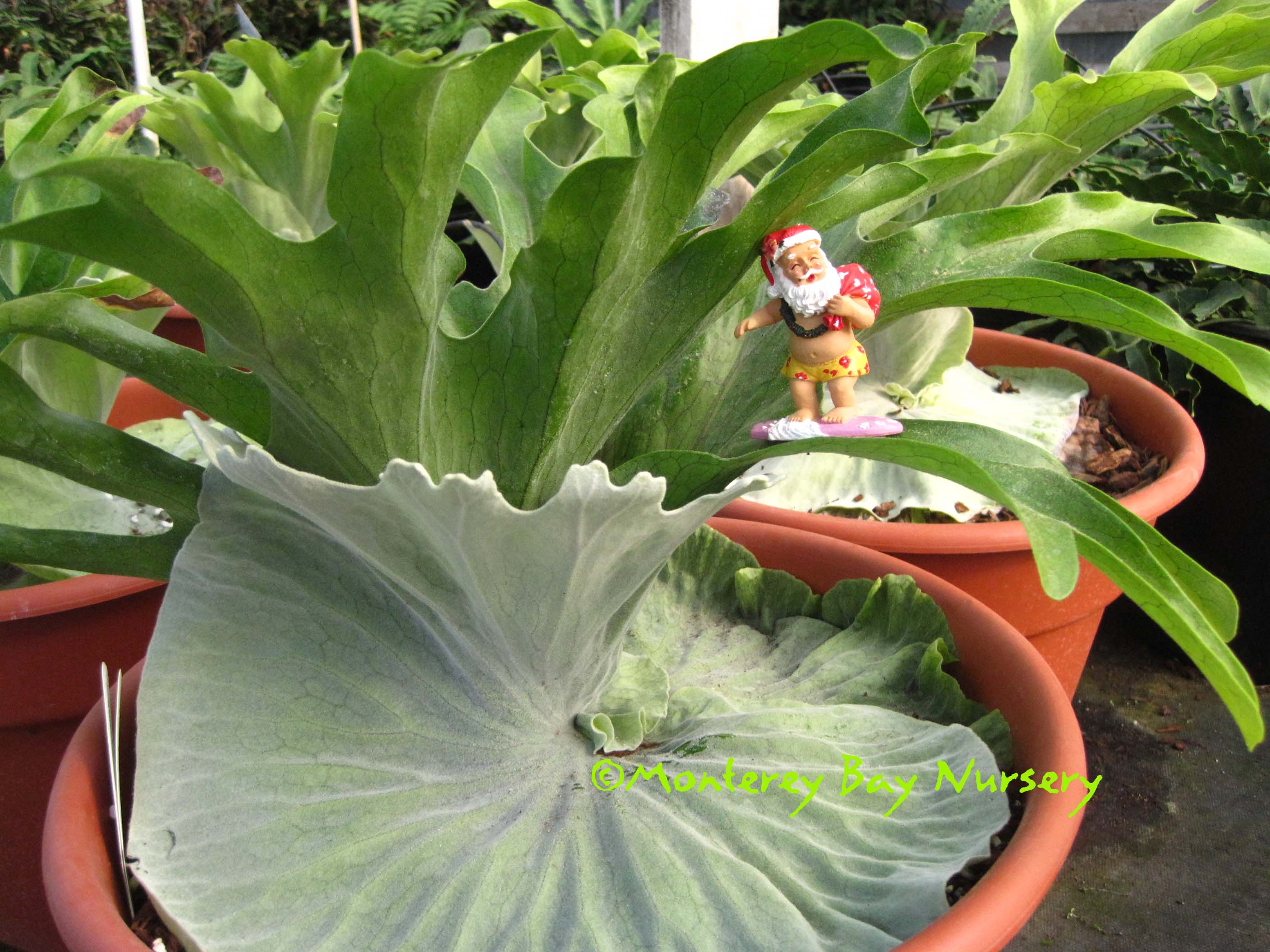 superbum   GIANT STAGHORN FERN   Santa's gonna get crunched!    Richard Josephson's Santa Cruz specimen    Raleigh's first crop    bug's-eye view    sponge-like indumentum absorbing morning dew   in front of the wave   behind the wave      the most stupendous Staghorn you're likely to see in cultivation, along with its rarer close relative P. grande, above. This species can grow drier and cooler, and is easier to cultivate outside in California. Mature plants can reach a staggering 8-10' across and 6-8' in overall height if you include its pendant fertile fronds. Sterile fronds are shaped like breaking waves, with indented lobes along the upper ("crest") edge, and can be 4-5' across on mature plants. Often fronds will wrap completely around the plants' support, which can be tree trunks, limbs or rocks. In small plants they will circle around to engulf and overgrow the opposite edge. Pendant fertile (spore-producing) fronds are narrow, about 12-18" across, with deep, coarse lobes. They only occur on very large, mature plants. Native to seasonally dry tropical and subtropical Australasia, this species is actually considered rather cold and drought tolerant. It adapts well to our own cool-Mediterranean, coastal Northern California climate and likes our warm winters, dry summers with foggy spells and cool, moist mornings. It does as well or even better in most of Southern California, especially near the coast, but will need some irrigation help during extended Santa Ana conditions. The upper surface of the lower "shield" frond is covered with a thin, glistening, whitish, felt-like layer of cells adapted to condense and absorb moisture, especially morning dew, or capture raindrops. My own plant, growing in a 14" container on my back porch in the Santa Cruz Mountains thrives during our summers and shines in winter, especially the long, wet ones. It was unfazed by the 24" of rain that fell at my house in a one month period. Very young plants will rot out under such cold/wet conditions however, and should be moved under overhead protection until they develop lower shield fronds large enough to protect their crown.  This plant will not form pups or offsets, it must be grown from spores. rev 9/2024