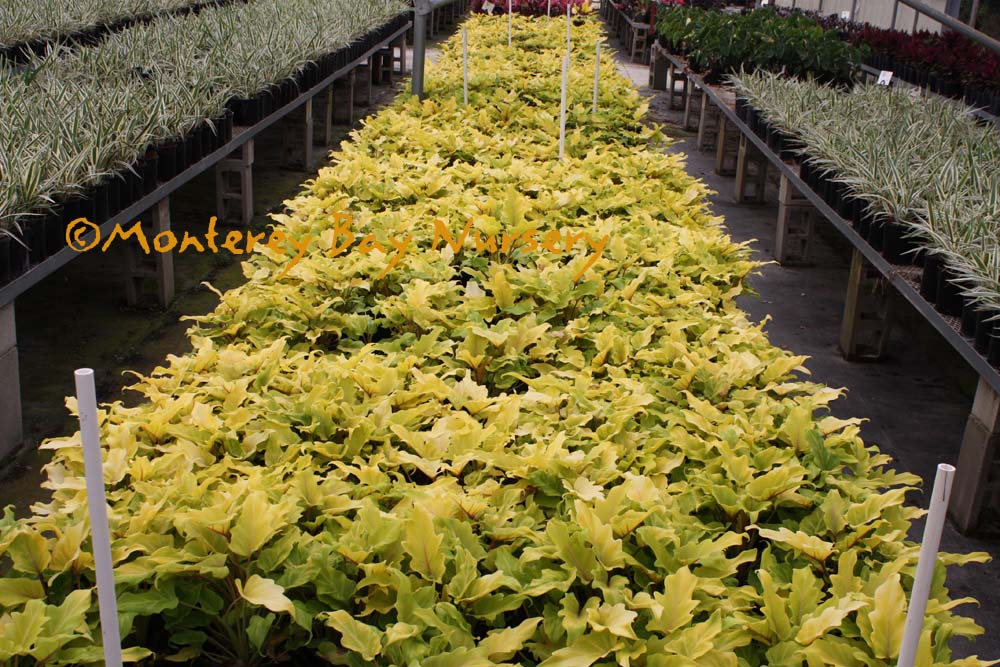 'Cape Susan'  (not currently in production)  new and older growth  a compact, dense grower that has a center-variegation pattern to the new growth. As the leaves age this fades to become just a conspicuous yellow midvein on the dark green leaf. Slow, growing just one or two feet per year. rev 2/2021
