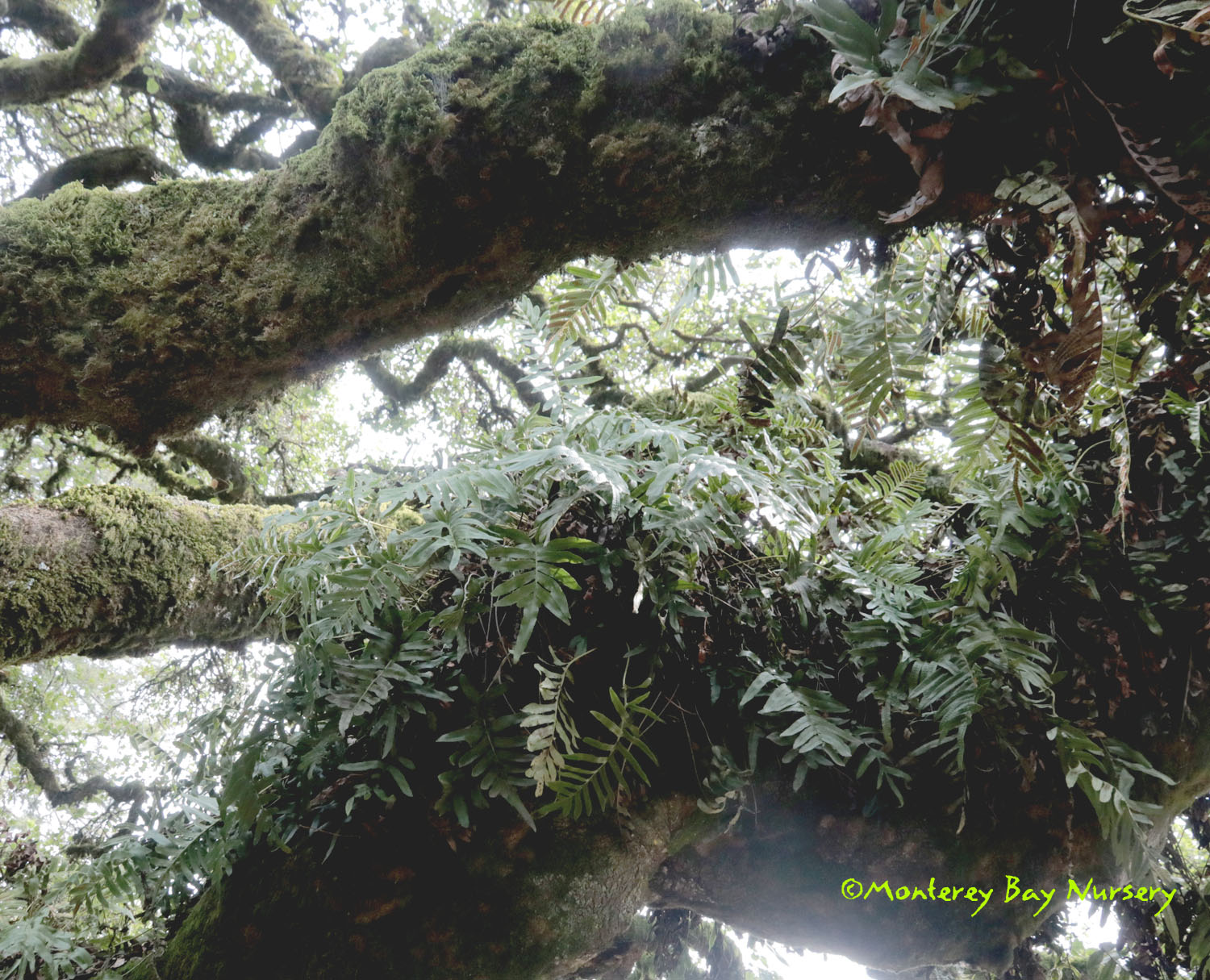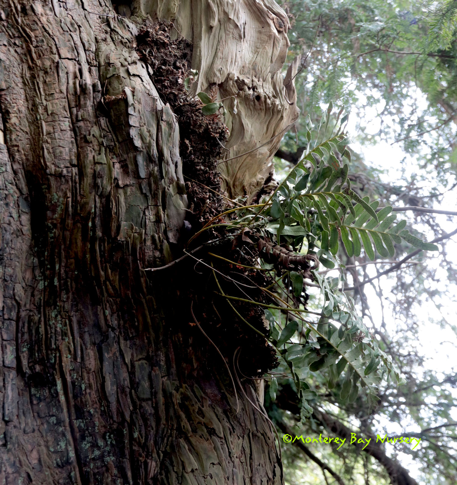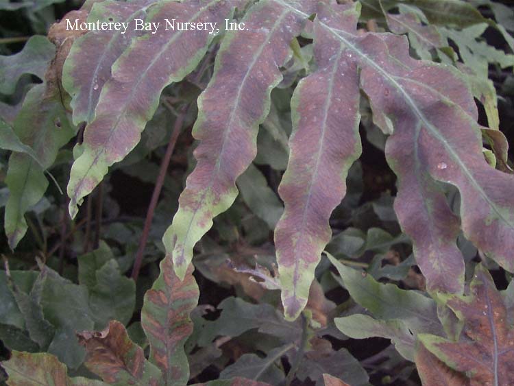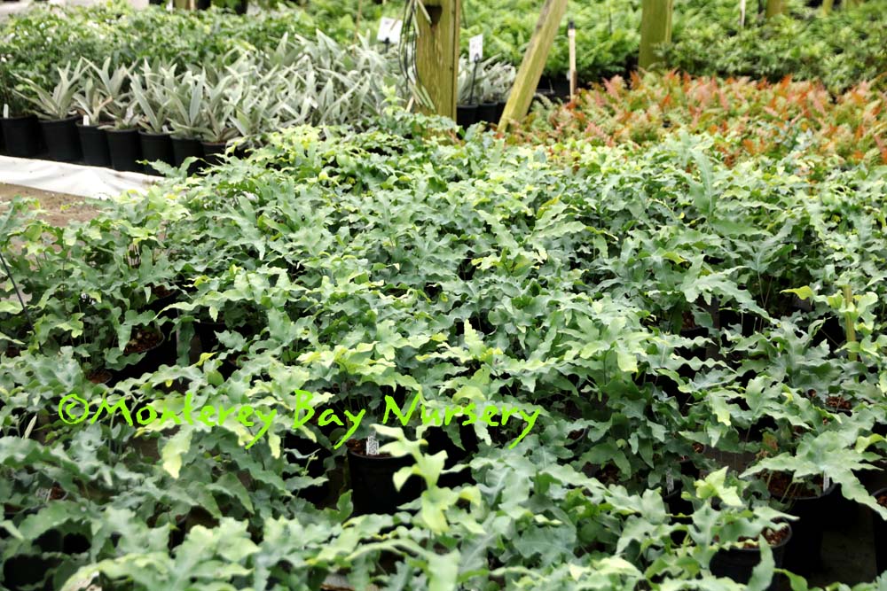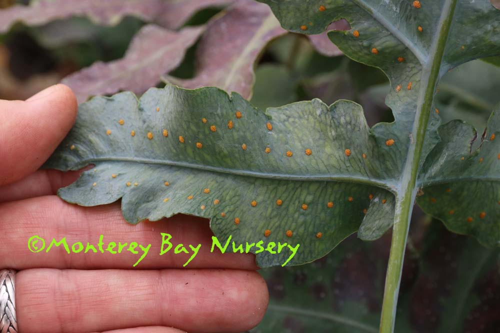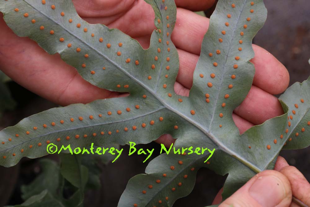 scouleri  COAST POLYPODY, CREEPING LEATHERLEAF   variegated   K-T Ranch ridge    live oak epiphyte   juvenile phase   redwood epiphyte    waaaay up   possibly the toughest, easiest, most reliable and forgiving species in this genus in the trade for Californians, and one of our natives. It is found in cool, marine-influenced, near-coastal habitats ranging from B.C. to Baja Calfornia and even its far-offshore Isla Guadalupe. It bears very dark green, coarsely toothed evergreen fronds to usually about 8-10" tall, easily distinguished by leathery texture and very large sori (spore-pods) on the undersides. Fronds on mature plants can get quite large - check out those linked images above, taken along the ridge of K-T Ranch at the south end of the Santa Cruz Mountains above Watsonville, where the fronds on those massive epiphytic plants can reach almost 2' long by more than 1' wide. It's This is a feature plant for a moderate-sized space or can serve as a small scale groundcover with regular watering. In reliably foggy climates (Central and North Coast) or cool summer rainfall areas (PNW) it grows quite well on old, shaded branches or even tree trunks and certainly would do so in hotter, drier areas with some short sprinkler-time a couple times a week. It's usually facultatively summer-deciduous if grown on rainfall alone in most areas. Of course it makes a great container subject, especially growing up onto that especially wicked, gnarly rock you put in it's pot, or even better established onto your old, mossy oak limbs, or mounted on planks/bark slabs like a Staghorn Fern. All those epiphyte-mounted plants need is a little summer sprinkling. We've offered several strains, ranging from commercially-sourced plugs to divisions from Old La Cuesta Grade (scavenged from a slide on the road), Old La Cuesta Grade Variegated (probably virused after arrival here, beautiful but worrying) to our current project 'KT Ridge,' grown from spores collected on a Tamia Marg walk to the top of the Kelly Thompson Ranch property at the very south end of the Santa Cruz Mountains, roughly the midpoint of their range. USDA zone 8/Sunset zones 5-9, 14-24. rev 6/2020