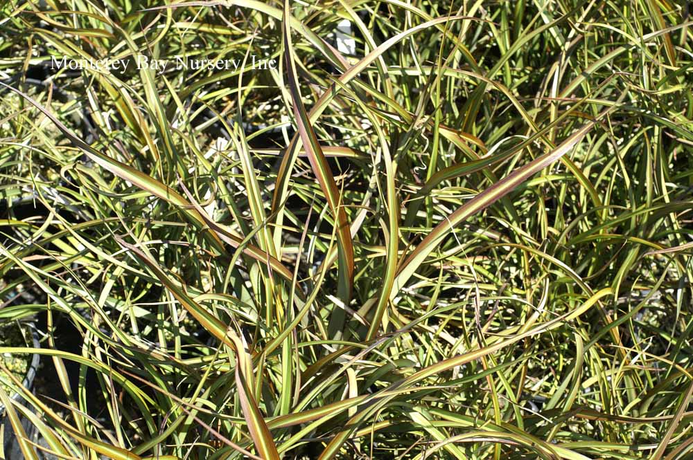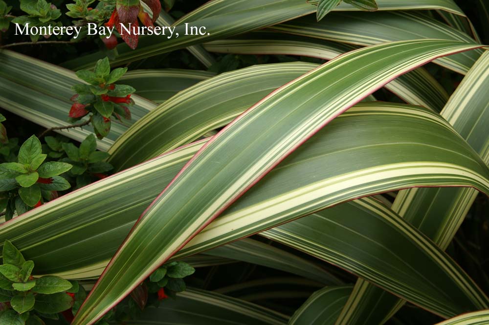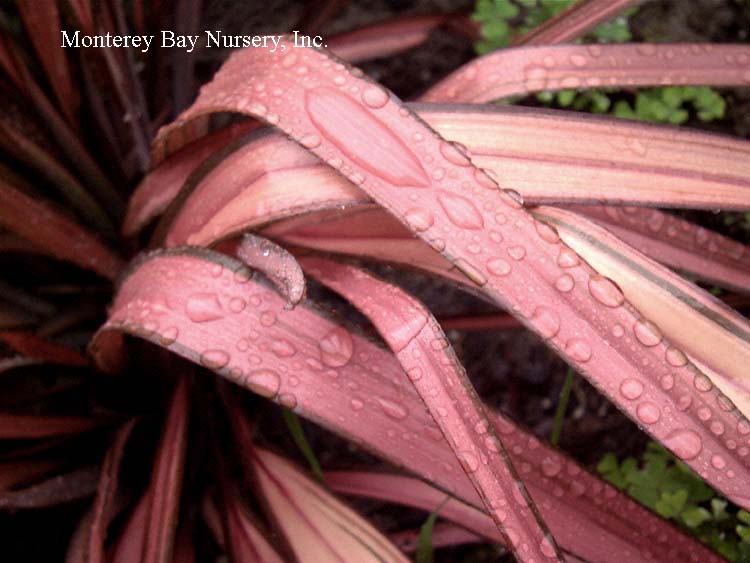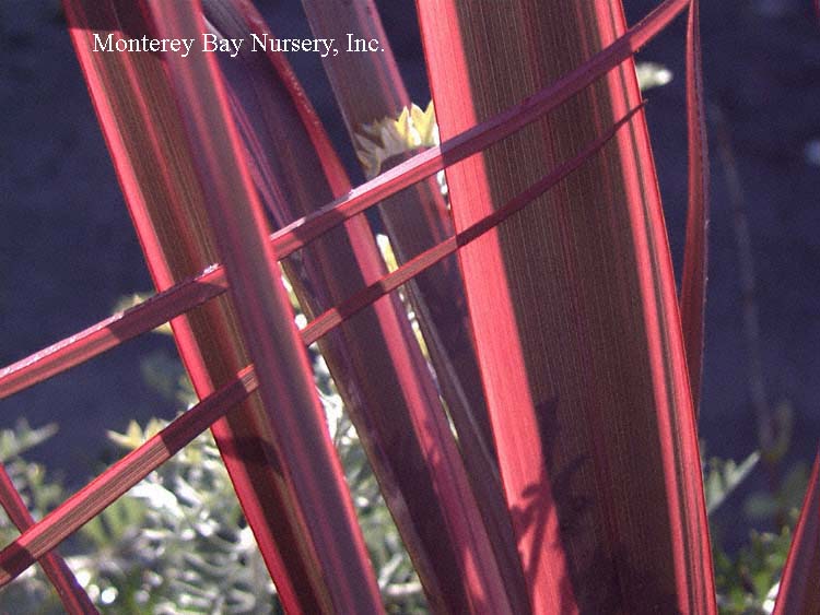 'Fireworks' PP#18504   colored blades   new and very pretty, a variegated form of Red Fountain Grass with pink, white, and green. Graceful and arching, a stunner in the garden or in containers. About 24-30" tall, 24" wide. Sun to part shade. Average to little water. A worthwhile annual outside zones 8-24. rev 7/2010