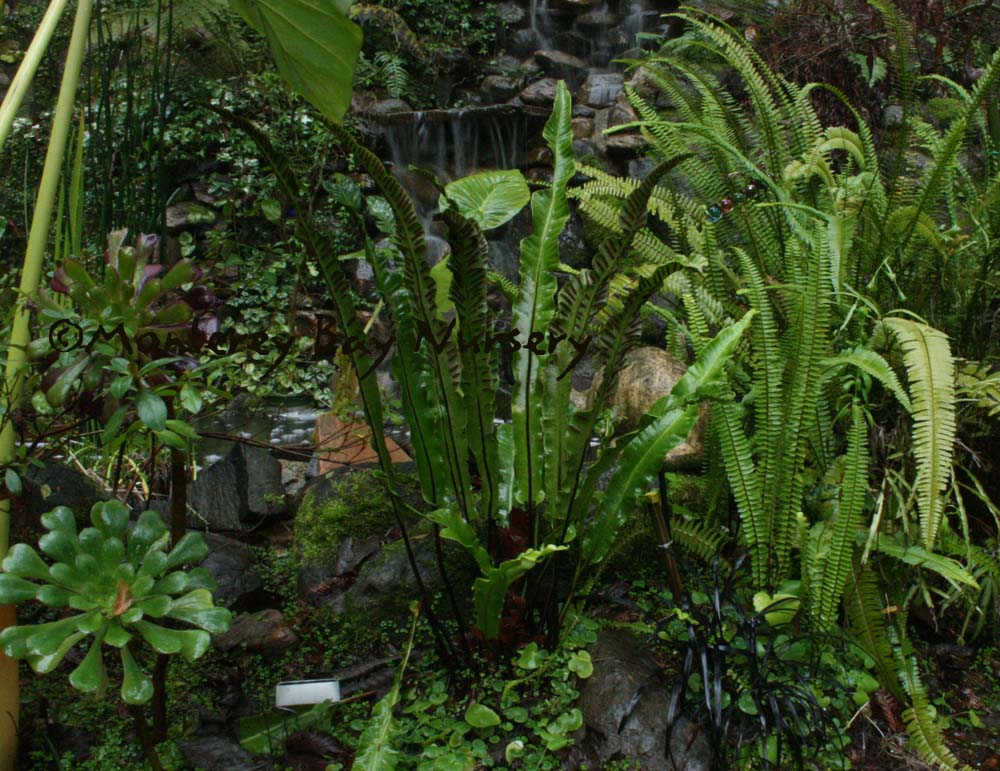 vittata   CHINESE BRAKE FERN  mature, UC Berkeley Botanic Garden    elegant blue juvenile fronds   last year's tiny trial crop was such a knockout we knew this would be a smash hit. The Narrow pinnate fronds have thin, pointed leaflets and grow in a usually-circular, open rosette to about 12-16" tall by 3' or more across., much resembling a Sword Fern. This atypical species thrives in high light sites, even growing in full sunlight in humid or cool areas. But under shady conditions, especially deep shade, the fronds, and especially the juvenile fronds display that highly-sought, ethereal, iridescent turquoise blue sheen characteristic of ferns that grow under very low light conditions (Sellaginella, Microsorum, Elaphoglossum) and at least a few other Angiosperms as well, some of which grow in very high light situations (Stegolepis, and hey check out those rhodies in back in the UCBBG image above, plus those thingies on the left - Rhoea? Aspidistra?). This is a tough one, tolerating rather dry conditions but doing best with regular, intermittent watering and good drainage. Great in containers also of course. Hardy to USDA zone 8. Eastern Asia, now widely distributed in tropical areas. rev 4/2019