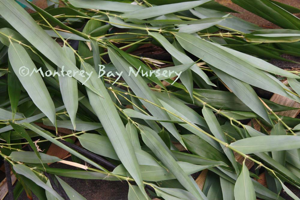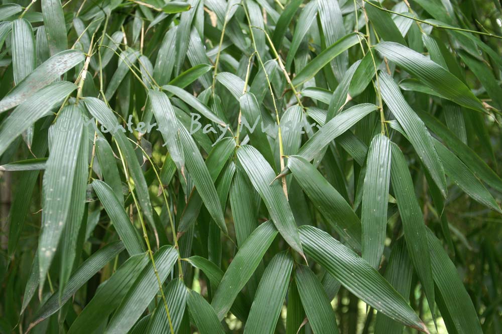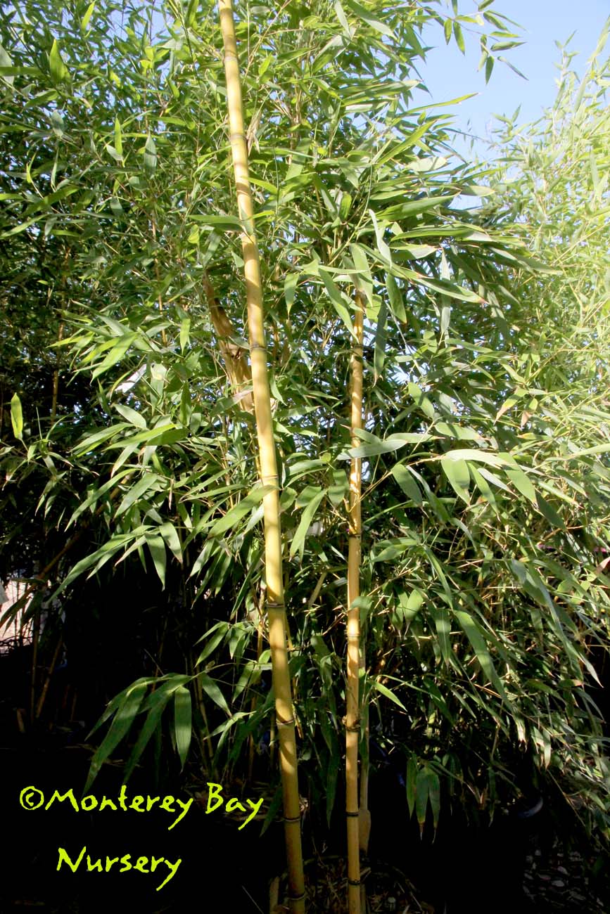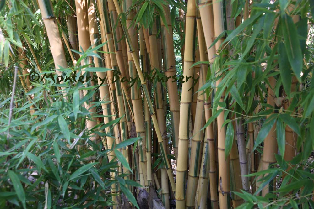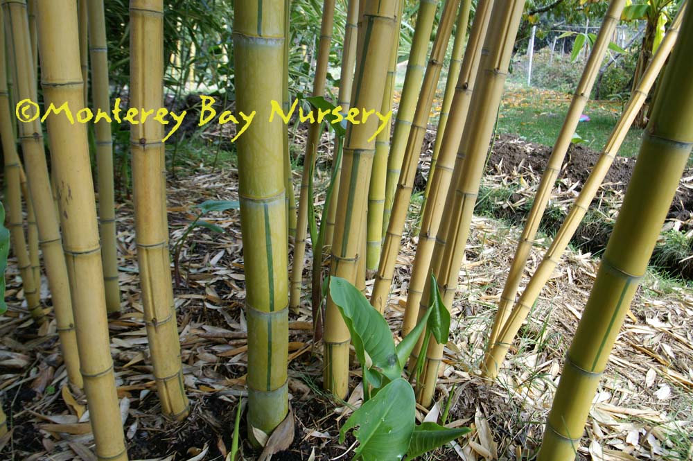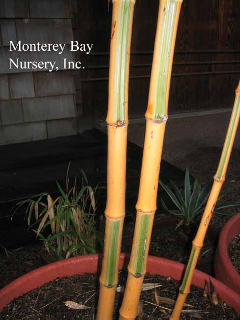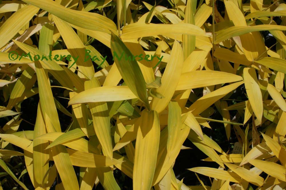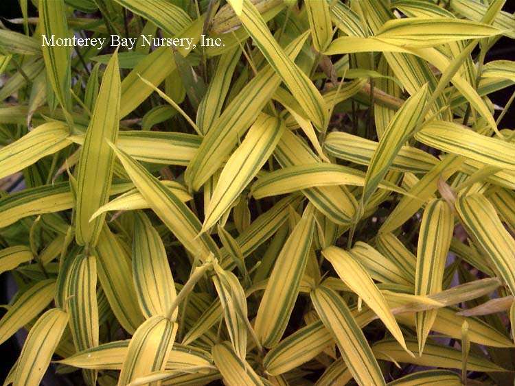 Pleioblastus viridistriatus (Arundinaria viridistriata)  foliage  a relatively low, running bamboo of low to moderate vigor. No, really! Because it has limited green foliage, it only grows a fraction of the speed of other short, spreading species like A. disticha. Still, it will fill to the extent of watered areas if not contained. Grows to 3’ tall with bright yellow leaves boldly striped with green and chartreuse. Makes a stunning focal point when used as a large container plant (especially in blue). It is also nice contrasted against purplish or blue foliage, or other dark backgrounds, but needs yearly attention to contain its spread if a root barrier isn't used. Sun (very yellow-gold foliage, fast growth) to mostly shade (light green-chartreuse, slow growth), average watering (fast) to very little (very slow),  at least occasional watering and better with regular irrigation, very frost hardy (USDA zone 6?). Find more info on bamboo in general here. Japan. Graminae/Poaceae. rev 9/2019