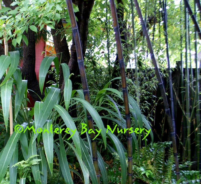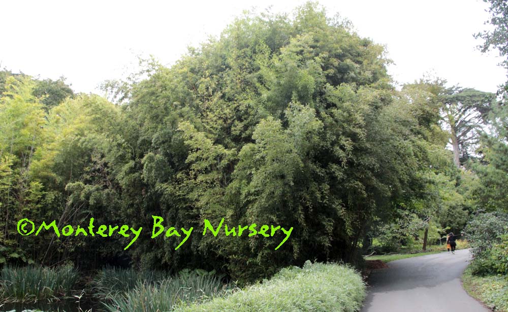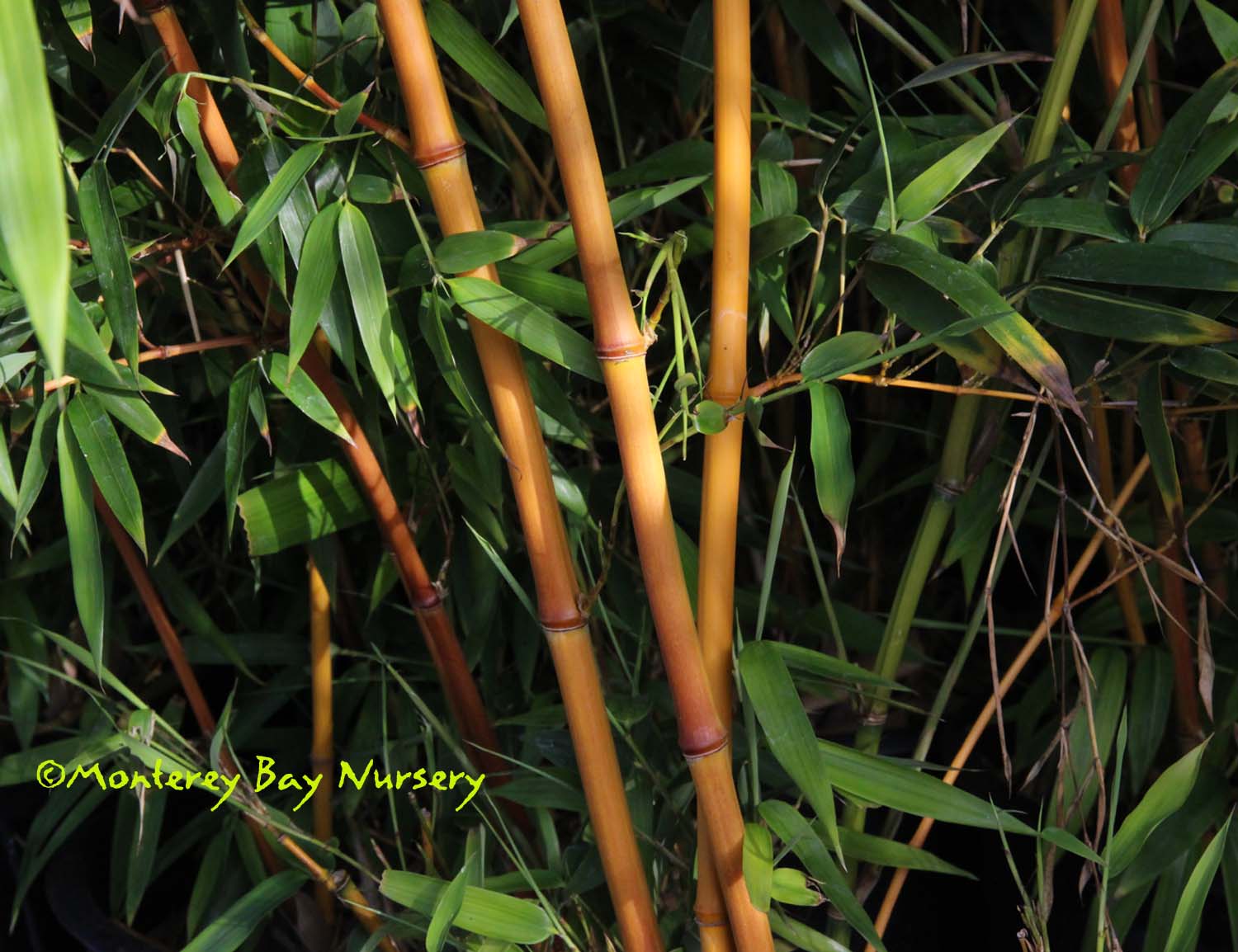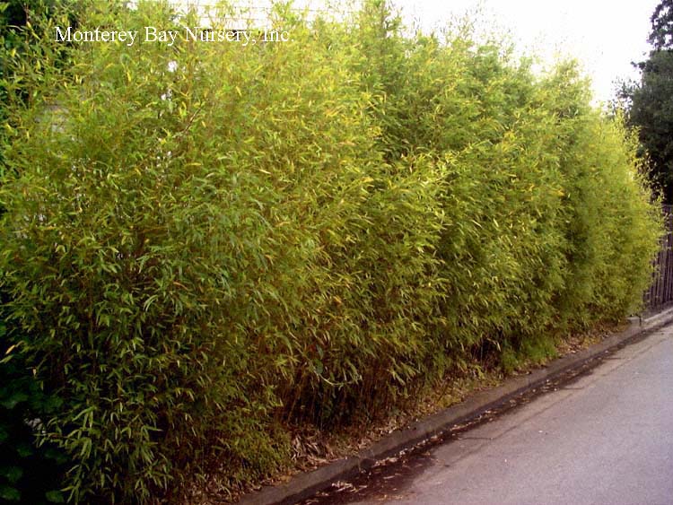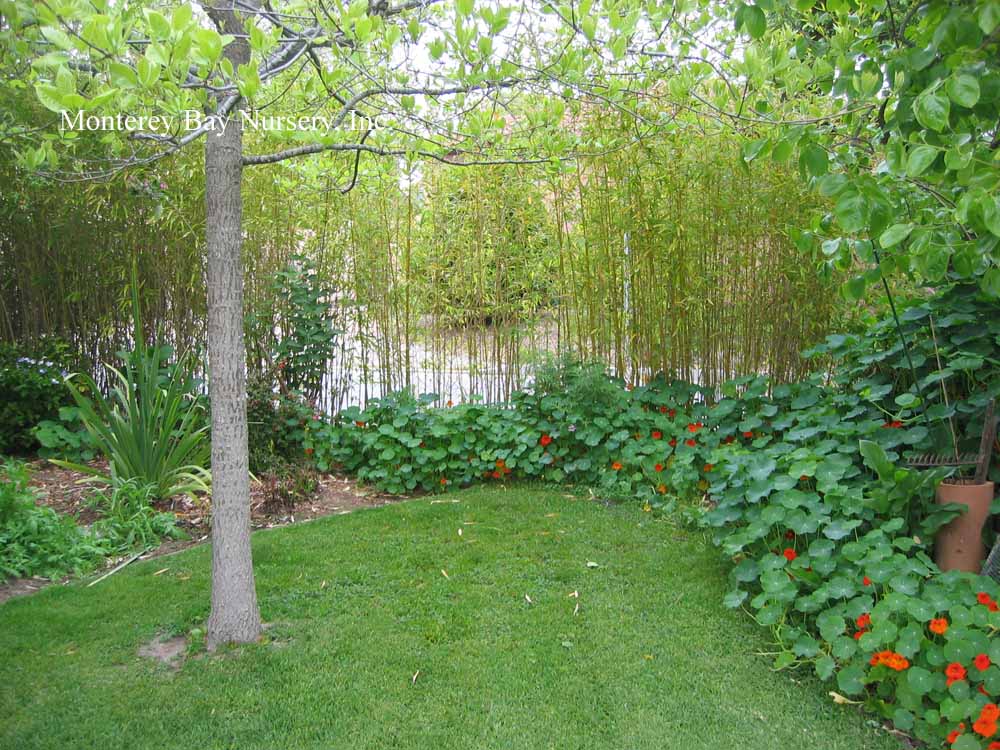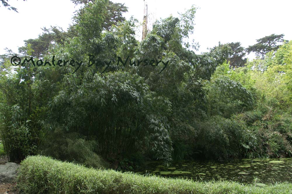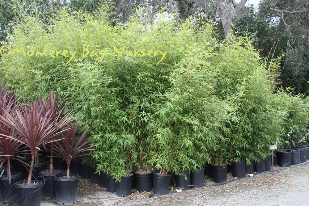 Pleioblastus viridistriatus (Arundinaria viridistriata)  foliage  a relatively low, running bamboo of low to moderate vigor. No, really! Because it has limited green foliage, it only grows a fraction of the speed of other short, spreading species like A. disticha. Still, it will fill to the extent of watered areas if not contained. Grows to 3’ tall with bright yellow leaves boldly striped with green and chartreuse. Makes a stunning focal point when used as a large container plant (especially in blue). It is also nice contrasted against purplish or blue foliage, or other dark backgrounds, but needs yearly attention to contain its spread if a root barrier isn't used. Sun (very yellow-gold foliage, fast growth) to mostly shade (light green-chartreuse, slow growth), average watering (fast) to very little (very slow),  at least occasional watering and better with regular irrigation, very frost hardy (USDA zone 6?). Find more info on bamboo in general here. Japan. Graminae/Poaceae. rev 9/2019