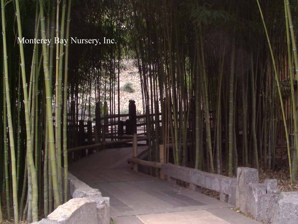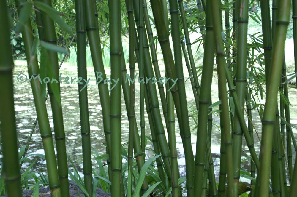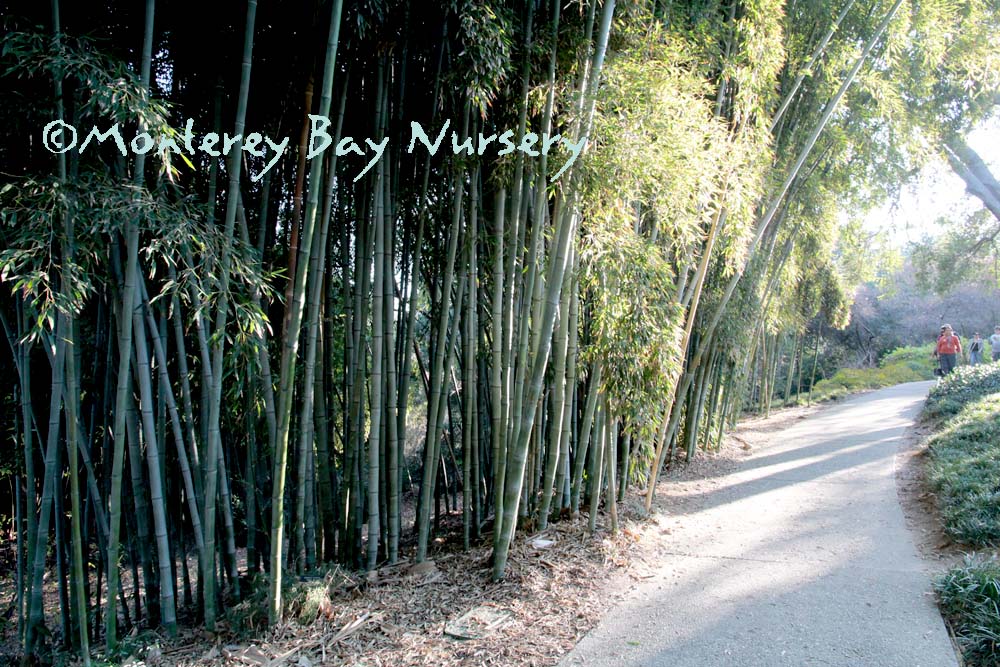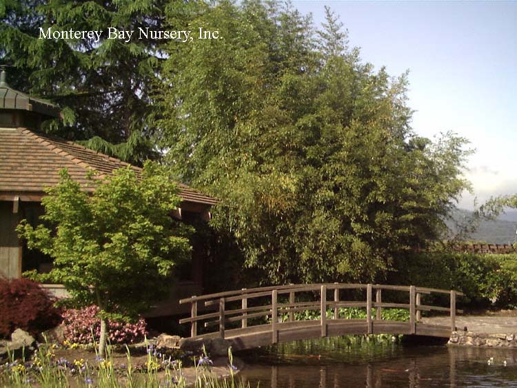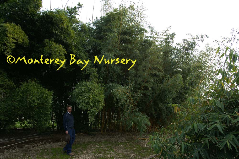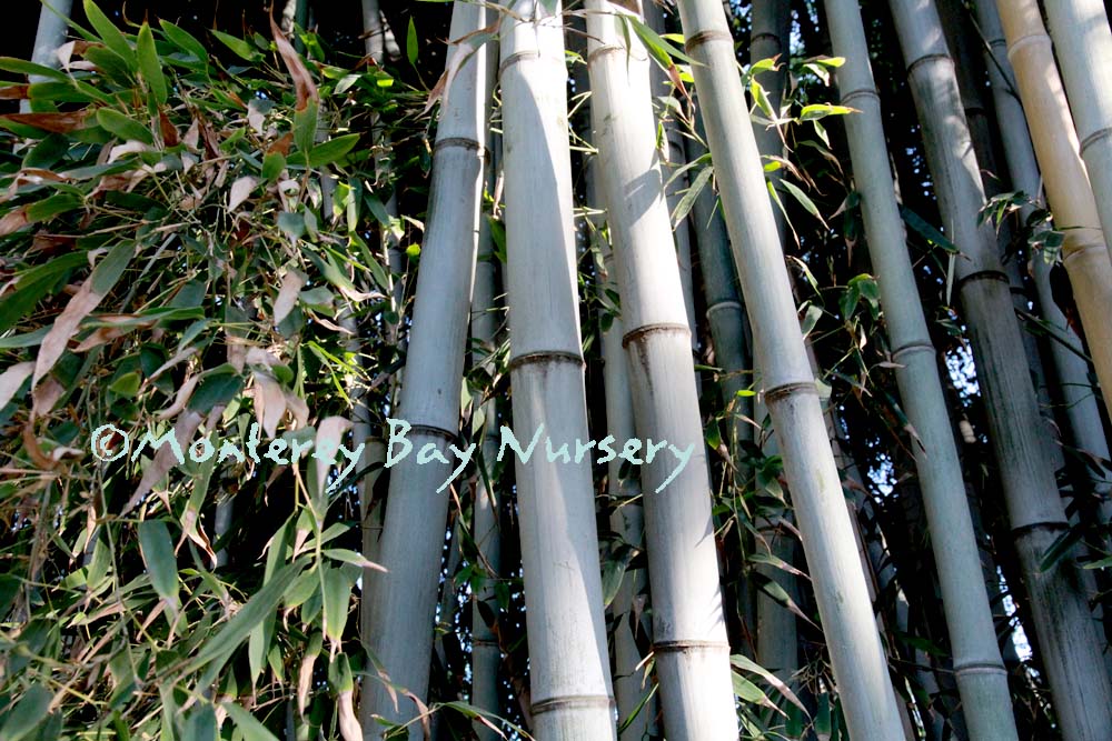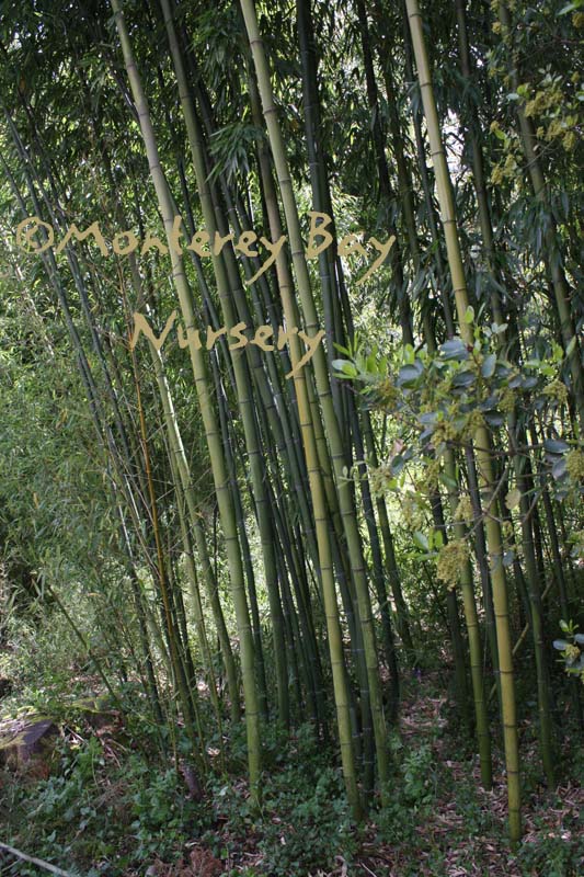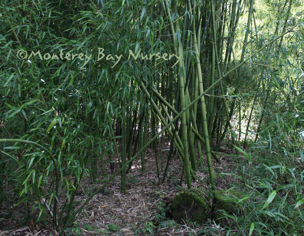 Pleioblastus viridistriatus (Arundinaria viridistriata)  foliage  a relatively low, running bamboo of low to moderate vigor. No, really! Because it has limited green foliage, it only grows a fraction of the speed of other short, spreading species like A. disticha. Still, it will fill to the extent of watered areas if not contained. Grows to 3’ tall with bright yellow leaves boldly striped with green and chartreuse. Makes a stunning focal point when used as a large container plant (especially in blue). It is also nice contrasted against purplish or blue foliage, or other dark backgrounds, but needs yearly attention to contain its spread if a root barrier isn't used. Sun (very yellow-gold foliage, fast growth) to mostly shade (light green-chartreuse, slow growth), average watering (fast) to very little (very slow),  at least occasional watering and better with regular irrigation, very frost hardy (USDA zone 6?). Find more info on bamboo in general here. Japan. Graminae/Poaceae. rev 9/2019
