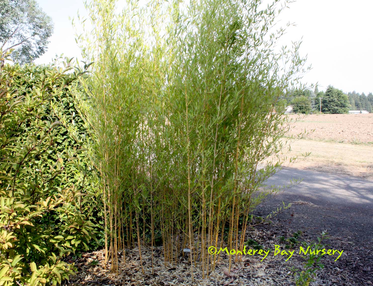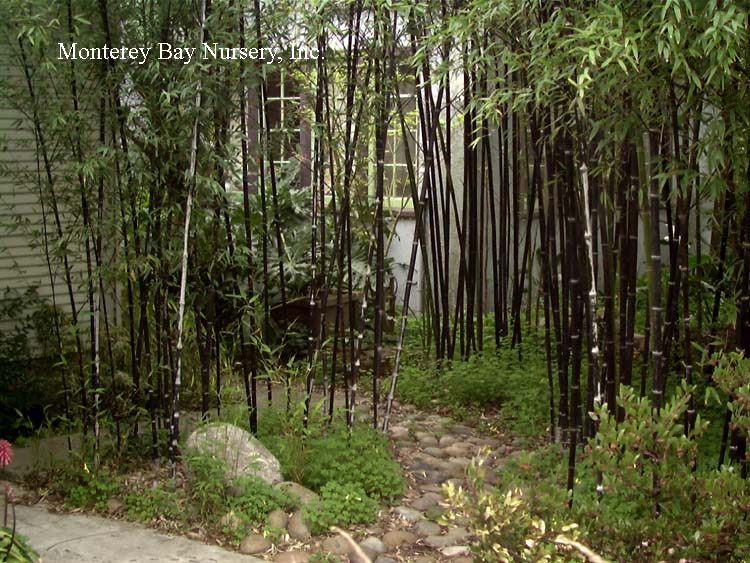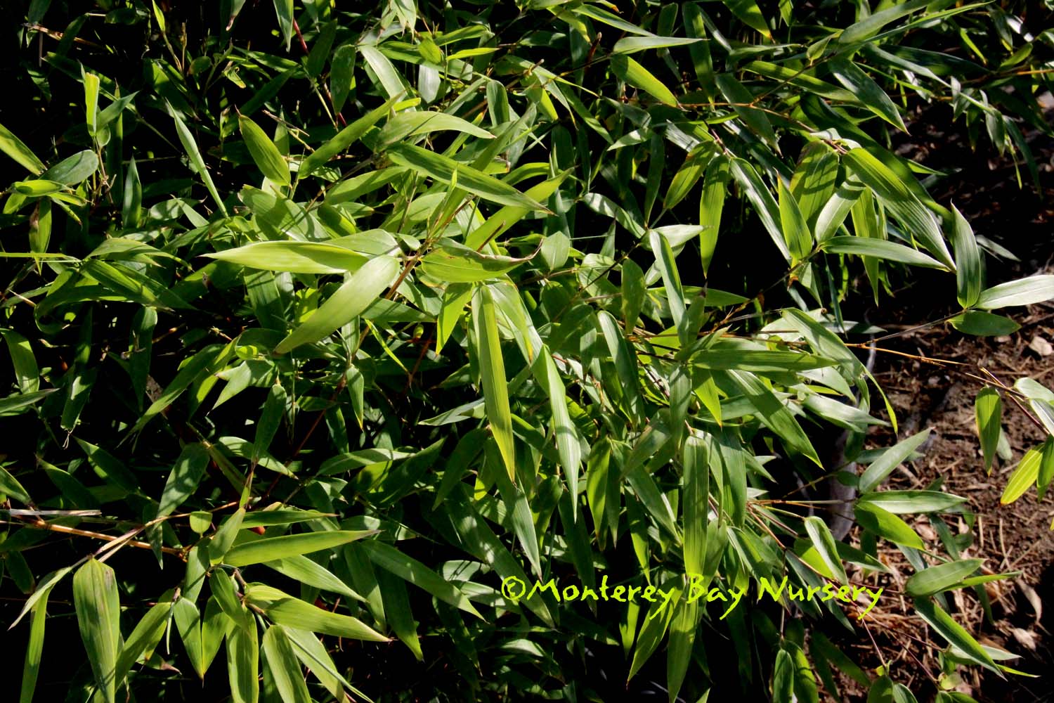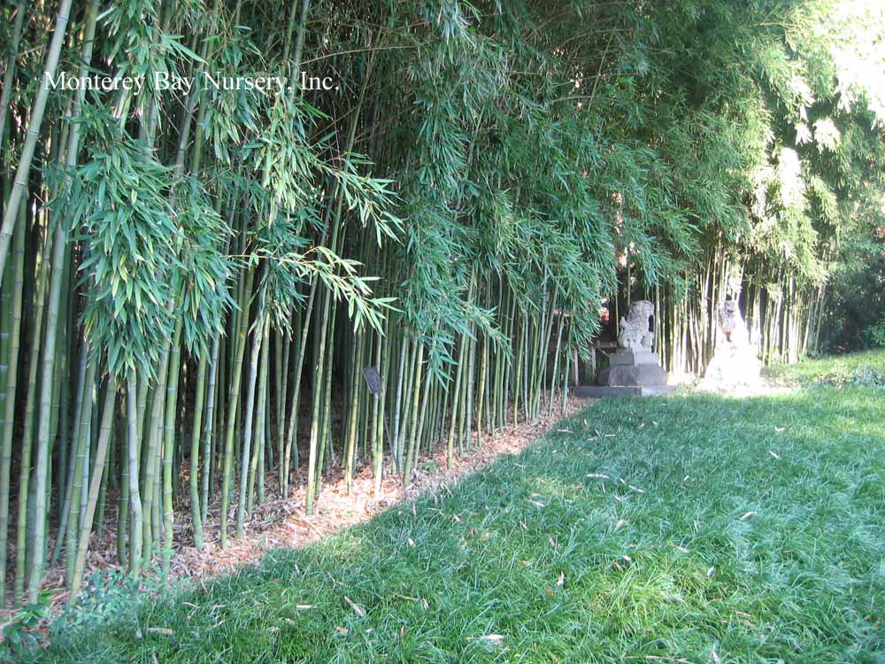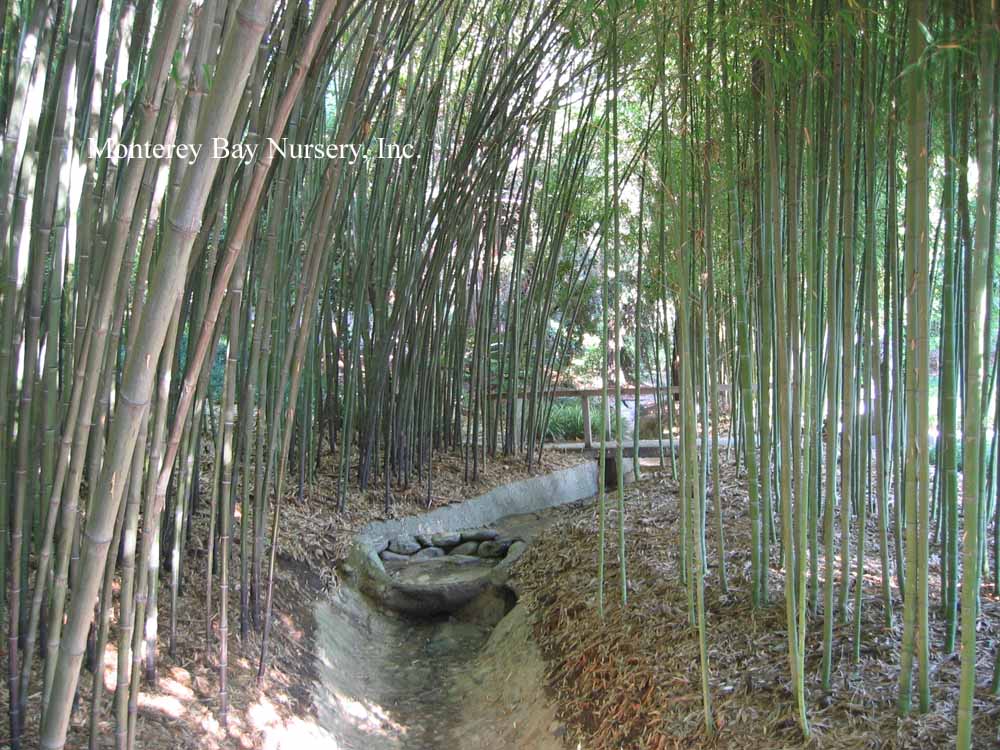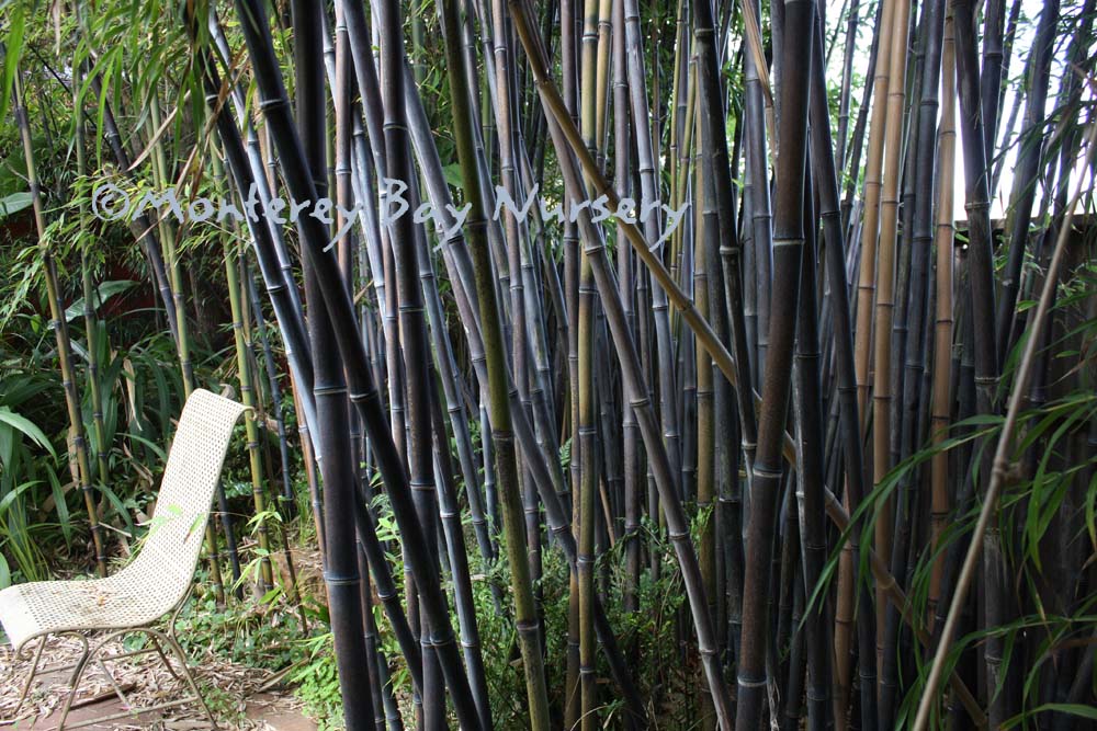 Pleioblastus viridistriatus (Arundinaria viridistriata)  foliage  a relatively low, running bamboo of low to moderate vigor. No, really! Because it has limited green foliage, it only grows a fraction of the speed of other short, spreading species like A. disticha. Still, it will fill to the extent of watered areas if not contained. Grows to 3’ tall with bright yellow leaves boldly striped with green and chartreuse. Makes a stunning focal point when used as a large container plant (especially in blue). It is also nice contrasted against purplish or blue foliage, or other dark backgrounds, but needs yearly attention to contain its spread if a root barrier isn't used. Sun (very yellow-gold foliage, fast growth) to mostly shade (light green-chartreuse, slow growth), average watering (fast) to very little (very slow),  at least occasional watering and better with regular irrigation, very frost hardy (USDA zone 6?). Find more info on bamboo in general here. Japan. Graminae/Poaceae. rev 9/2019