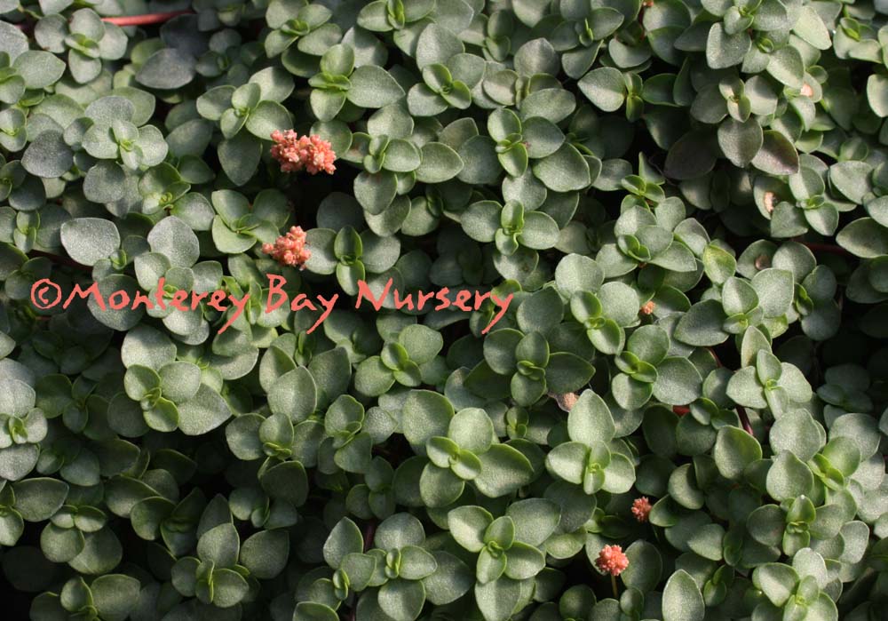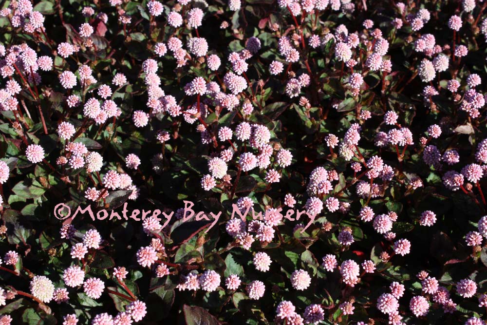 Polygonum capitatum  (not currently in production)   SMARTWEED  pink bubbles    a very tough little trailer, with lots of charming, little, round pink flowers most of the time in mild areas, where it is also evergreen. Only inches tall, and spreading by runners and by reseeding. An indestructible groundcover for parkways or unirrigated areas, but also a suitable choice for hanging baskets and containers. Sun or part shade, average to little water when established. Sunset zones 8, 9, 14-24/USDA 8.  rev 11/2010